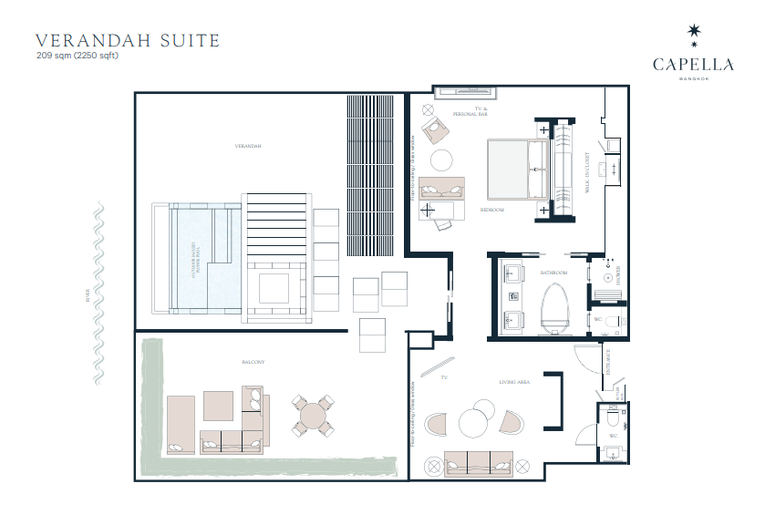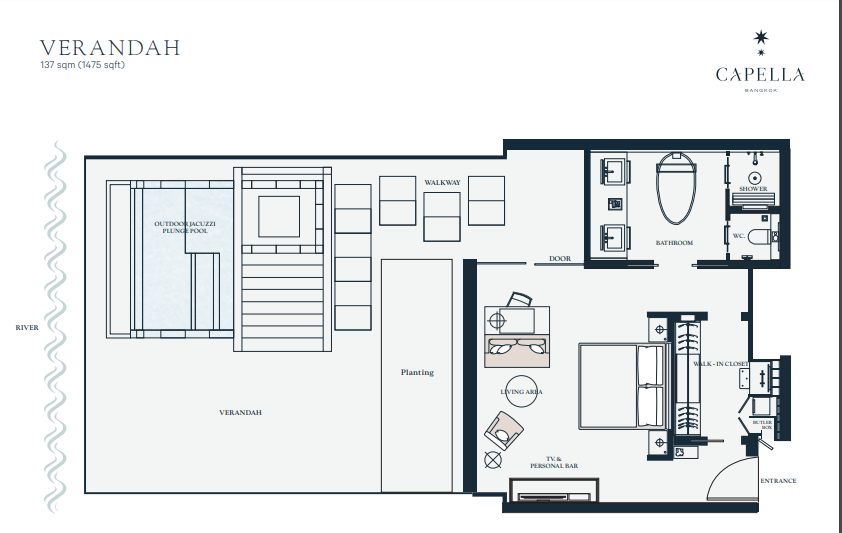Номера расположены на третьем этаже, двуспальная кровать king-size, гостиная зона софа-диваном, ванная комната с ванной и душем, гардеробная, просторная терраса с тайской беседкой и небольшим бассейном с джакузи, панорамный вид на реку, план номера;