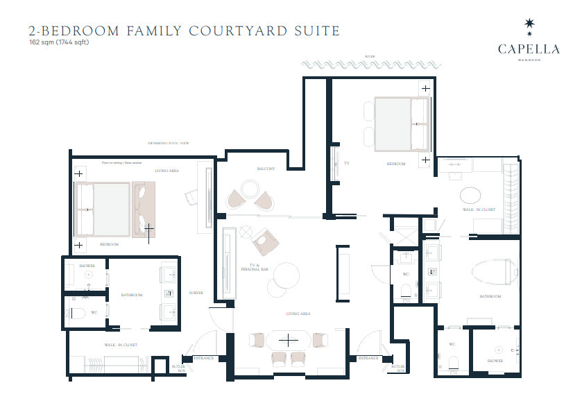 • 1 номер 2 Bedroom Family Courtyard Suite (162 м², макс. 5 чел.).
