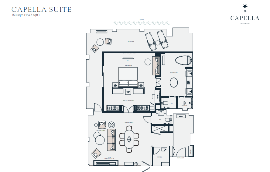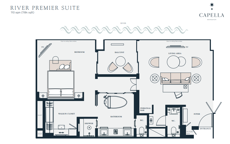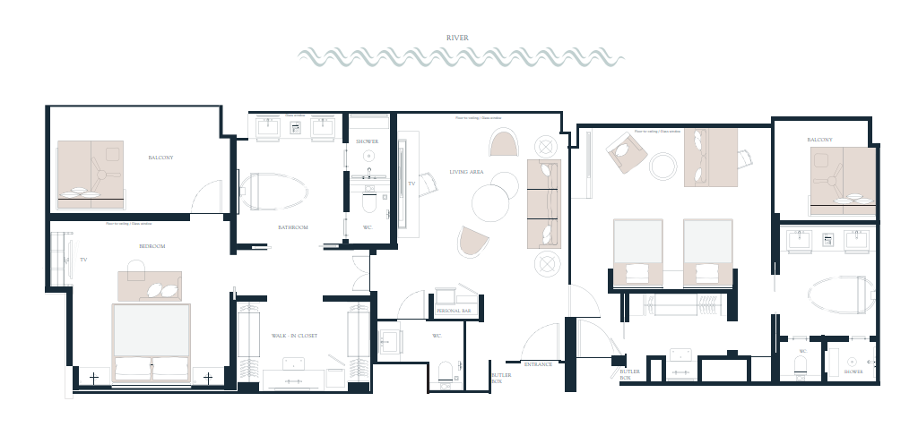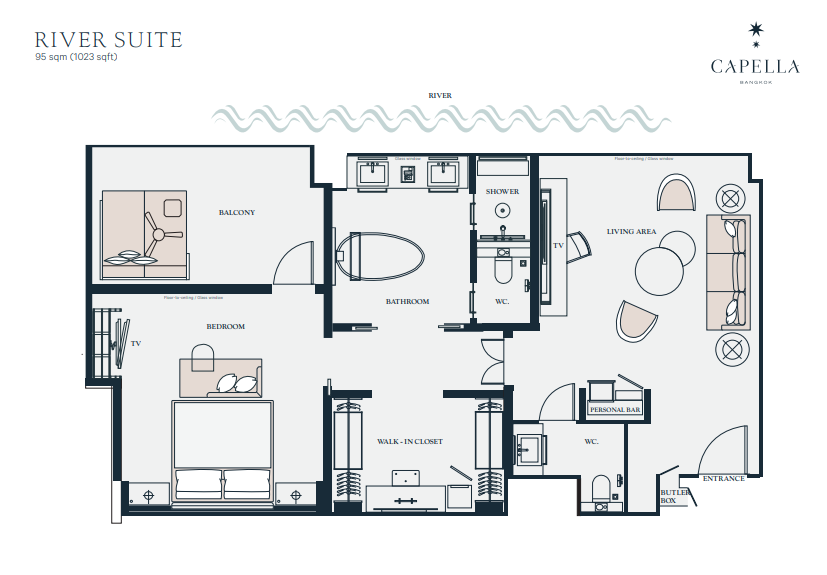 Двуспальная кровать king-size или 2 односпальные кровати, гостиная зона с софа-диваном, ванная комната с ванной и душем, гардеробная, меблированный балкон, вид на реку, окна от пола до потолка, план номера;