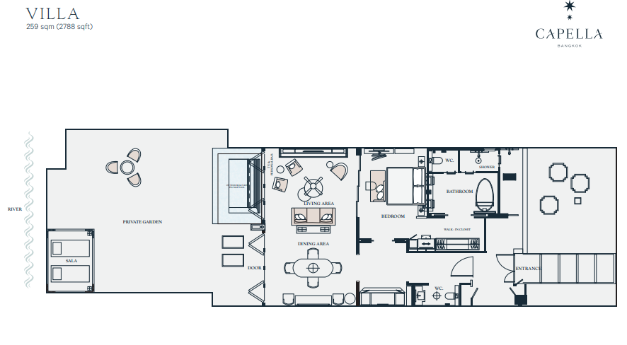 Номера расположены на третьем этаже, спальня с двуспальной кроватью king-size и гостиной зоной, отдельная гостиная комната с диваном, ванная комната с ванной и душем, гостевой туалет, гардеробная, просторная терраса с тайской беседкой и небольшим бассейном с джакузи, вид на реку, план номера;