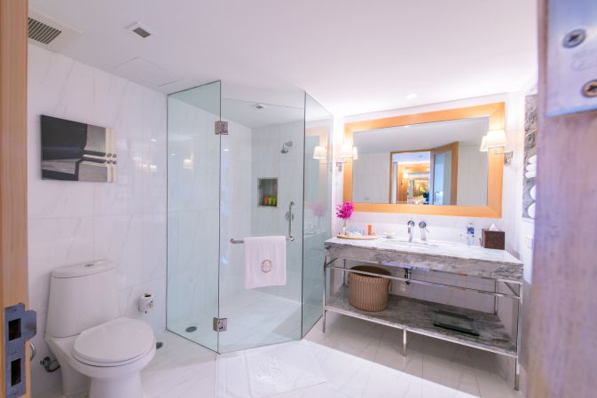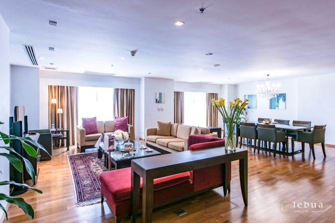 3 спальни: 2 двуспальные кровати king-size и 2 односпальные кровати, отдельная гостиная комната с диваном, обеденной зоной и кухней, стиральная машина и сушилка, меню подушек, 2 ванные комнаты, гостевая ванная комната, 4 балкона, вид на город, мини-бар (бесплатно), приветственное блюдо с фруктами, бесплатный приветственный ханговертини в люксе или в баре Sky (один на человека за весь период проживания).