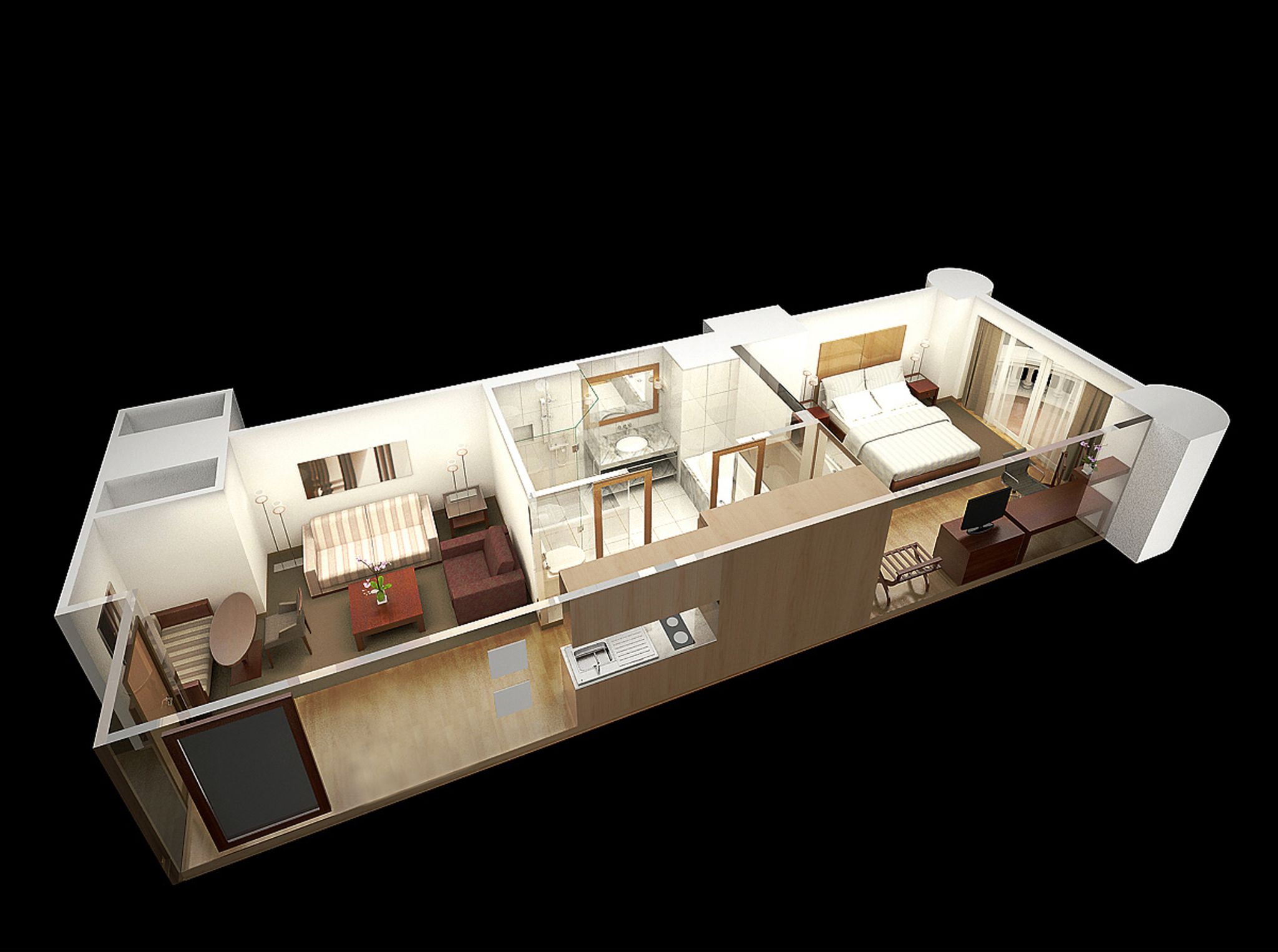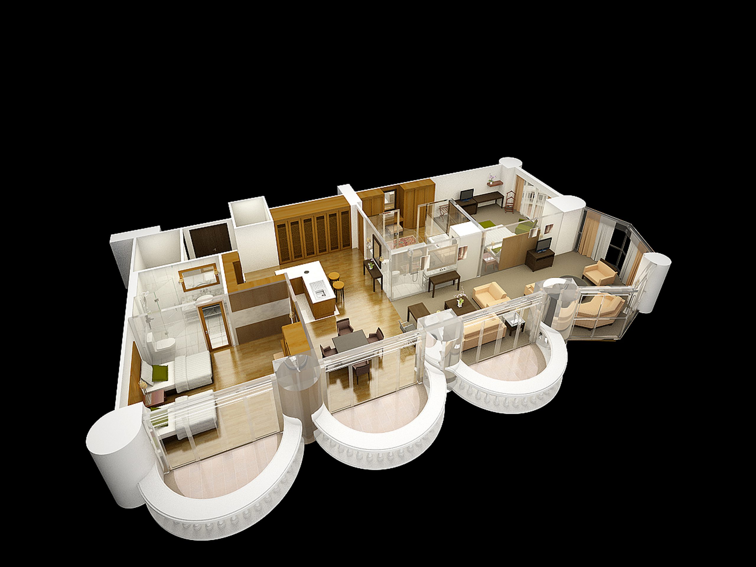 Расположены на верхних этажах (между 53-м и 59-м этажами), спальня с двуспальной кроватью king-size, отдельная гостиная комната с диваном и мини-кухней, ванная комната с ванной и душем, балкон, вид на город, эксклюзивный доступ в клубный лаунж Tower, план номера;