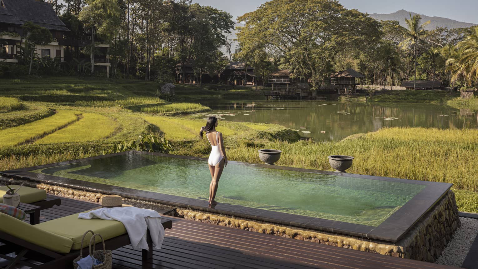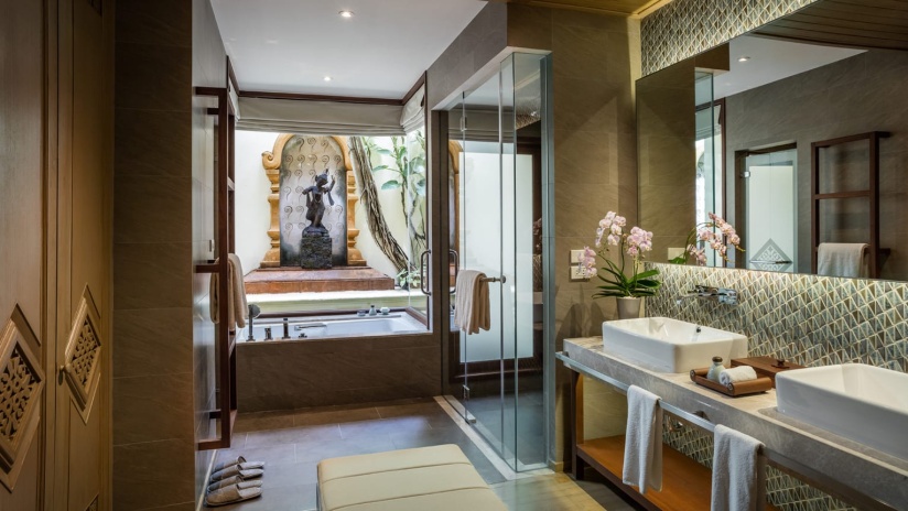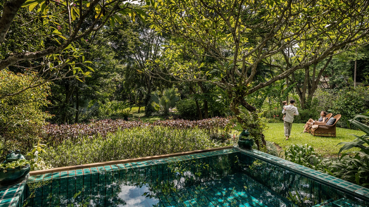 На северо-западной стороне курорта, 2 спальни: двуспальная кровать размера king-size и две односпальные кровати, 2 ванные комнаты, веранда, небольшой персональный бассейн размера 3 x 4 м, вид на сад и горы, услуги батлера, дополнительно: приветственный коктейль или моктейль, ежедневно пополняемый мини-бар (без алкоголя), детские принадлежности, глажка до четырех предметов одежды на номер, на 30 минут больше продолжительность на все процедуры в спа;