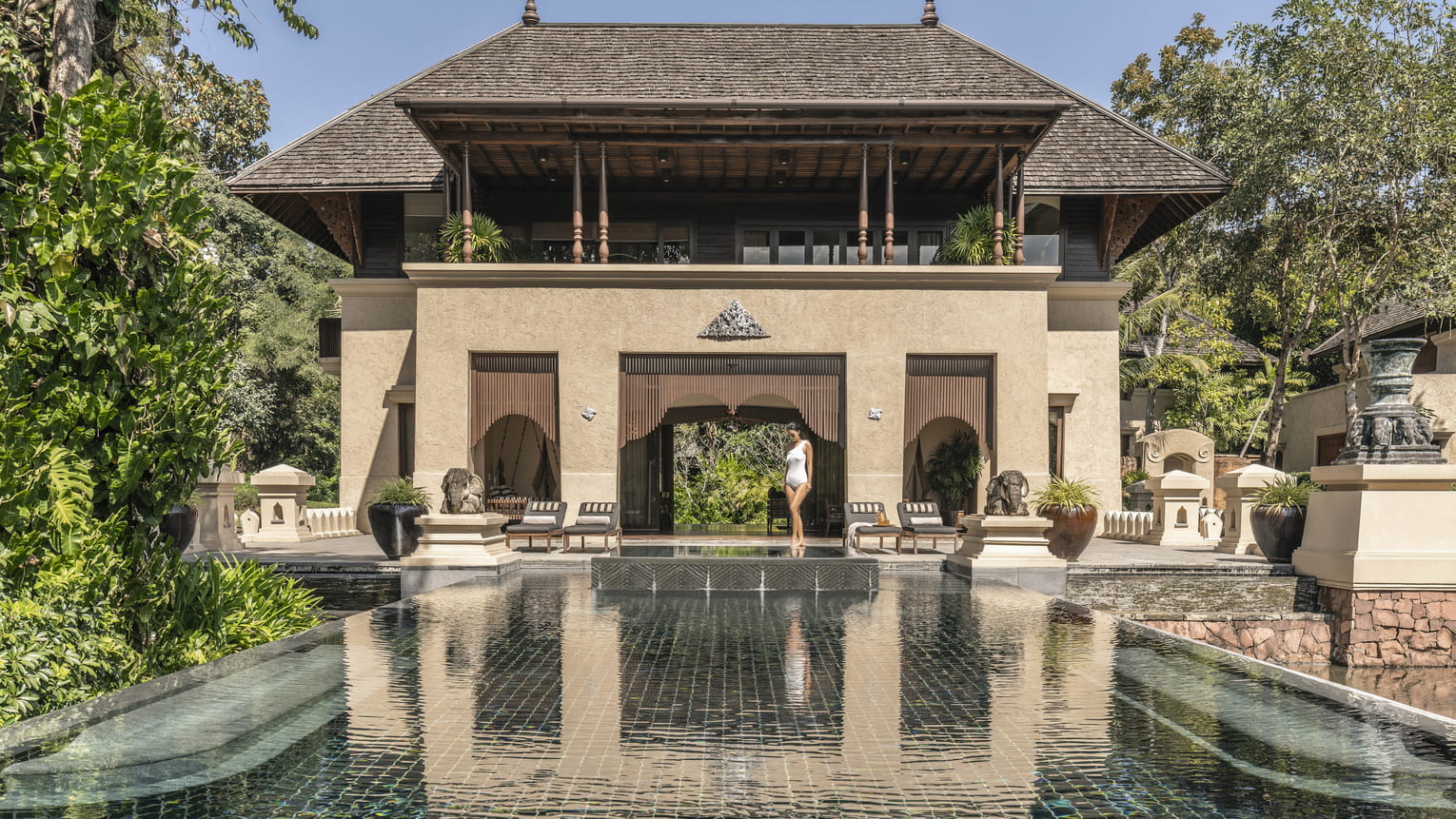Двухэтажная резиденция в восточной части курорта, 3 спальни: 2 двуспальные кровати king-size и 2 односпальные кровати, 3 ванные комнаты, гостевой туалет, душ под открытым небом, отдельная гостиная комната с обеденной зоной, кухня, персональный бассейн (размера 6 х 17 м), джакузи под открытым небом (размера 3,2 х 3,2 м), частный сад, панорамный вид на горы и на местность вокруг, услуги батлера, дополнительно: приветственный коктейль или моктейль, ежедневно пополняемый мини-бар (без алкоголя), детские принадлежности, глажка до четырех предметов одежды на номер, на 30 минут больше продолжительность на все процедуры в спа, см.план номера;