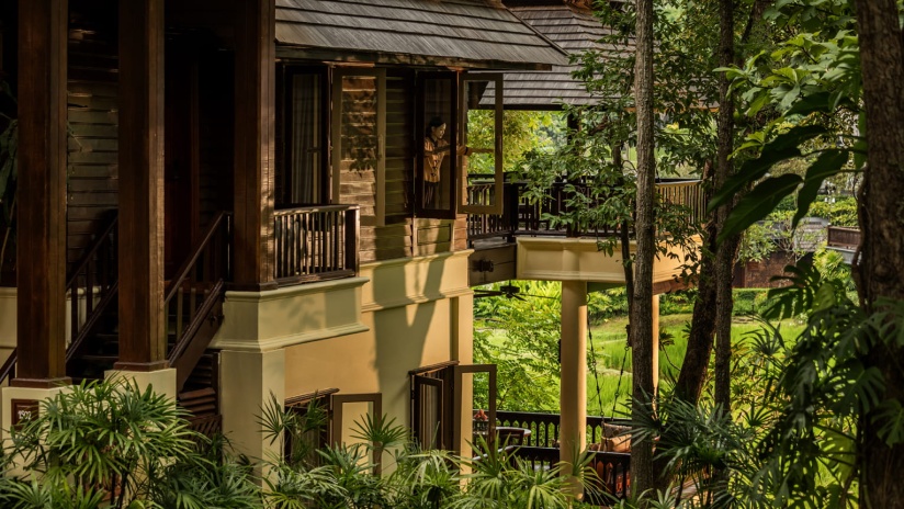 На верхних этажах, двуспальная кровать размера «king-size» или две односпальные кровати, высокие сводчатые потолки, ванная комната с ванной и душем, личное жилое пространство на открытом воздухе, панорамный вид на горный хребет Сутхеп и рисовые поля курорта, см.план номера;