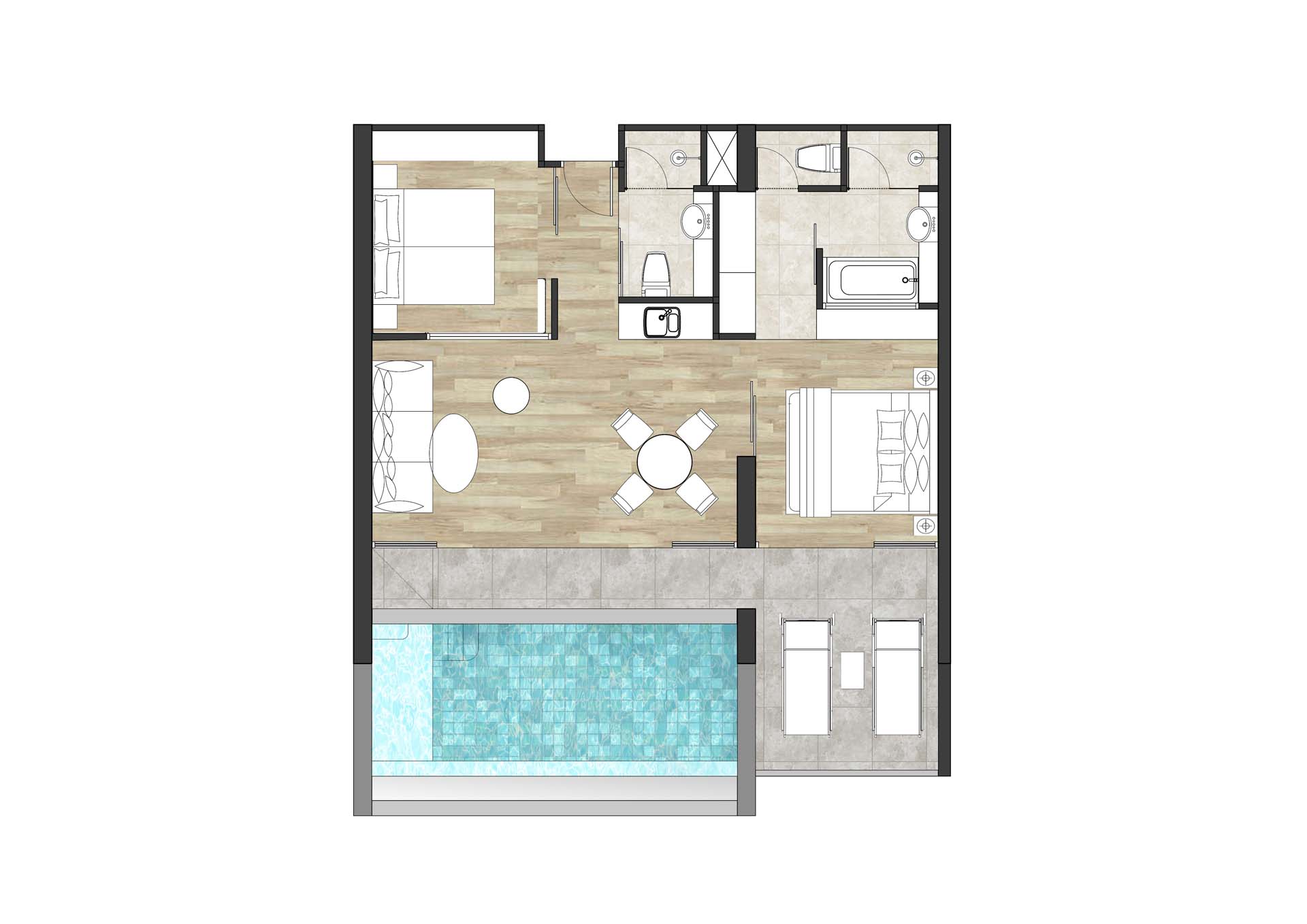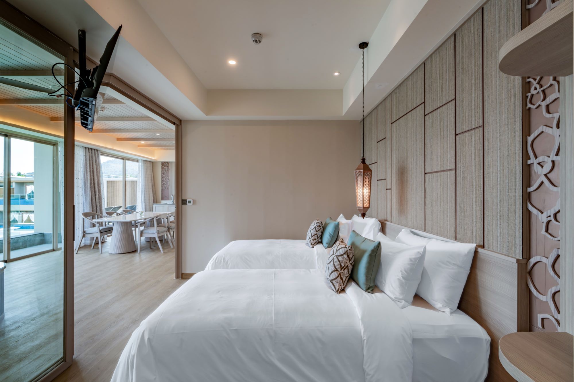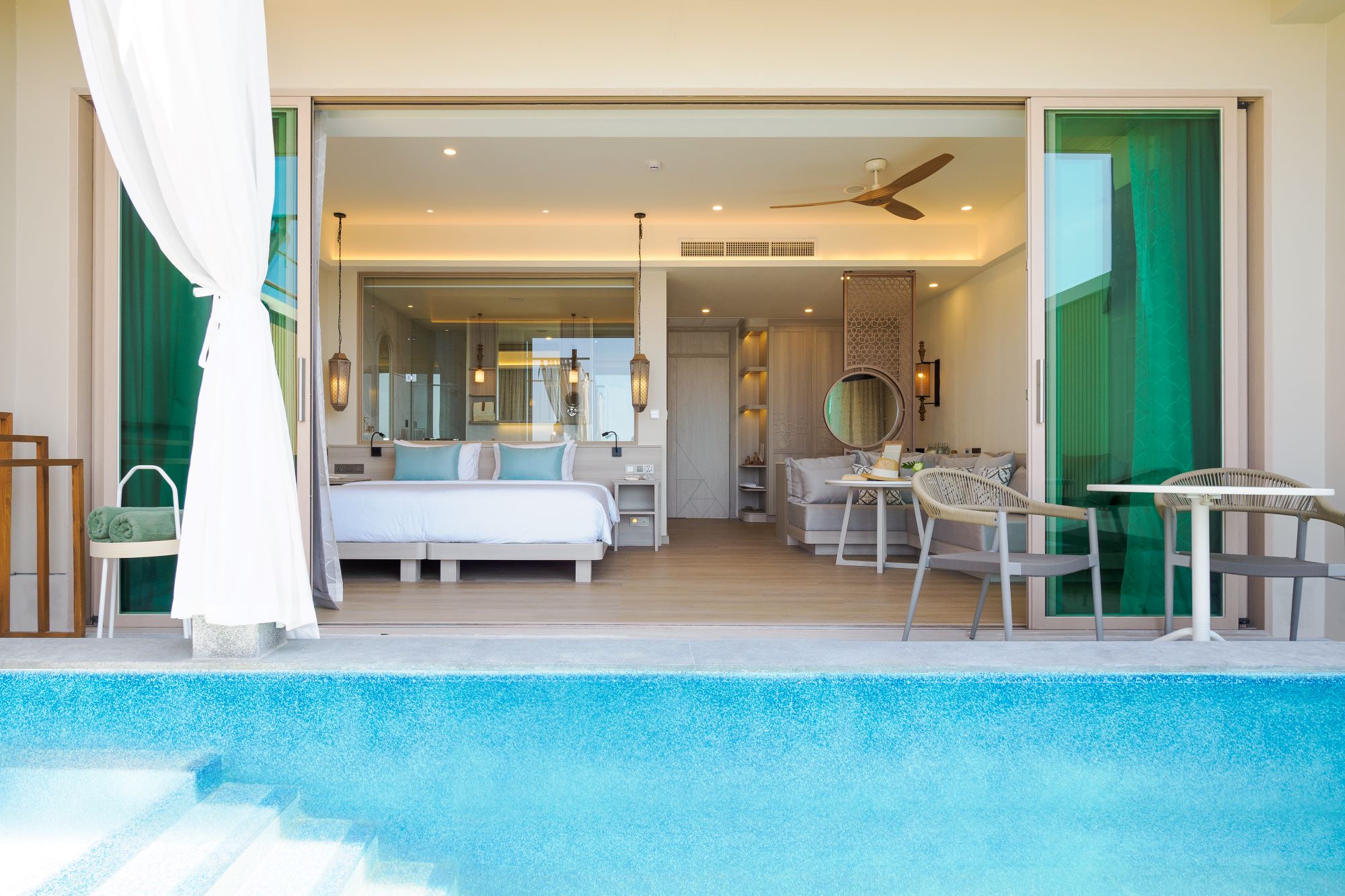 В отеле предлагаются два типа размещения, оба – с частными бассейнами. Сьюты находятся в трёхэтажном здании с видом на море, обеспечивая уединённый отдых. Виллы на берегу оснащены двумя бассейнами, создавая уникальные условия для отдыха у моря. Также к услугам гостей открытый бассейн, тренажёрный зал, массажный павильон.