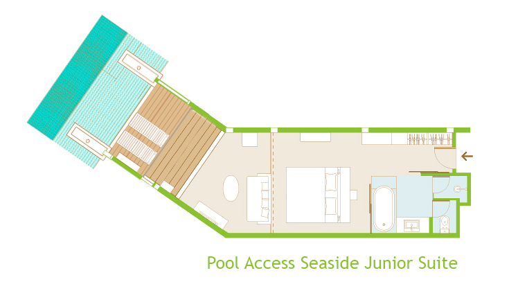 - 33 номера Junior Suite Pool Access (65 м², макс. 3 чел.).