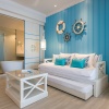 Двуспальная кровать или 2 односпальные кровати, гостиная зона с диваном-софа, ванная комната с ванной и душем, терраса, доступ к общему бассейну с террасы номера, боковой вид на море, план номера. Номера только для взрослых.