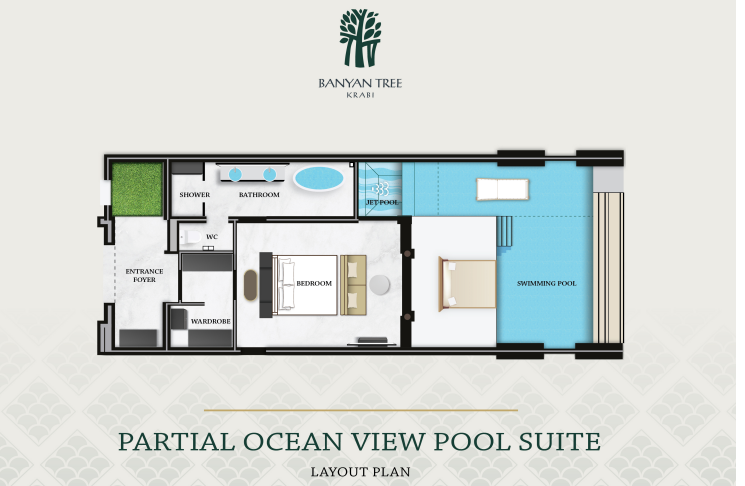 - 14 номеров Partial Ocean Pool Suite (99 м² с террасой и бассейном, макс. 2+1).