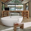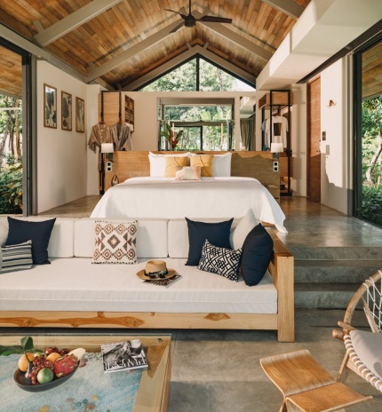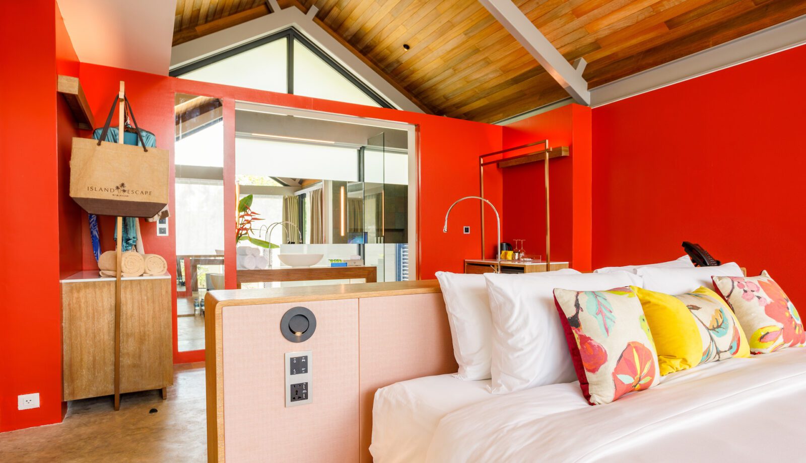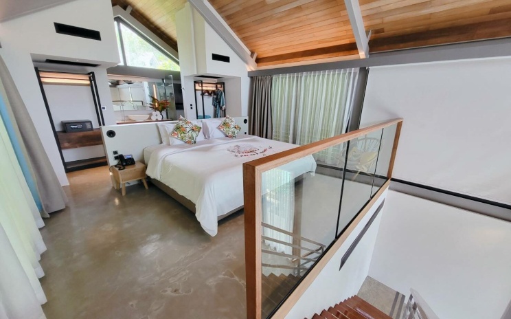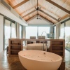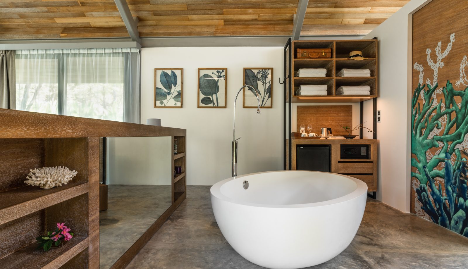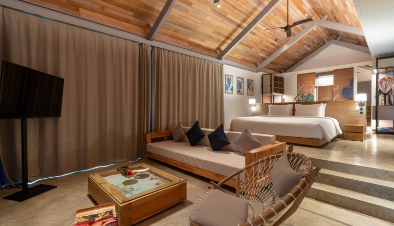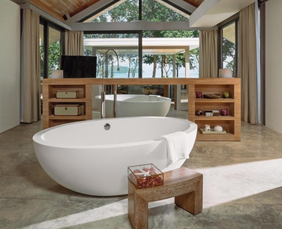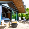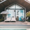 В зоне Ocean, вилла открытой планировки, двуспальная кровать king-size или 2 односпальные кровати, гостиная зона с диваном и креслами, ванная зона с ванной и тропическим душем под открытым небом, терраса с лежаками, небольшой персональный бассейн (13 м²), управление удобствами номера с помощью планшета;