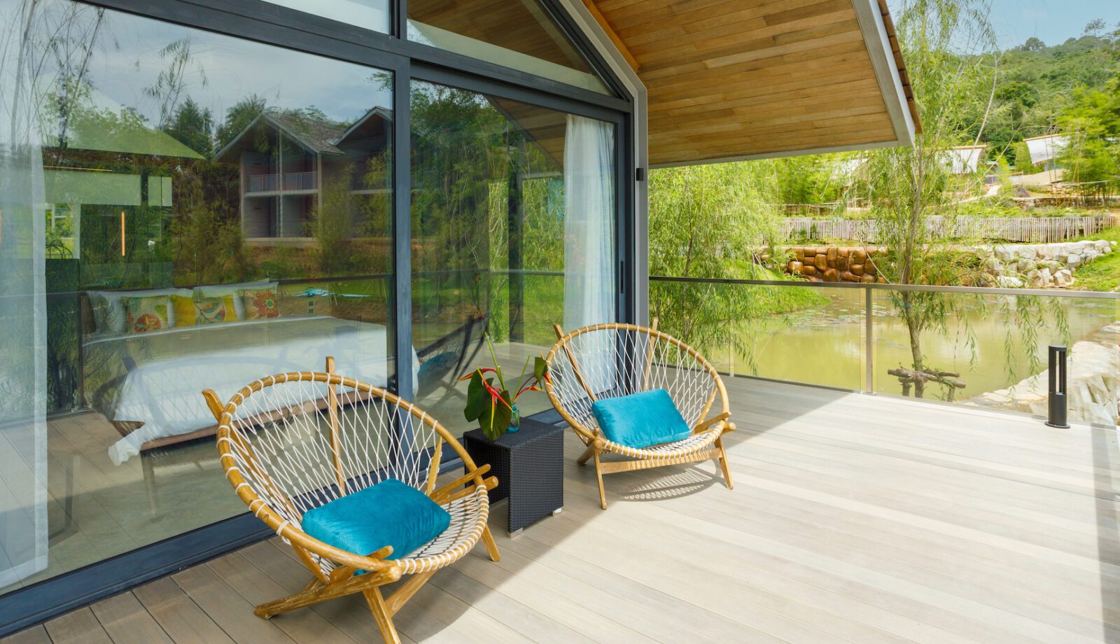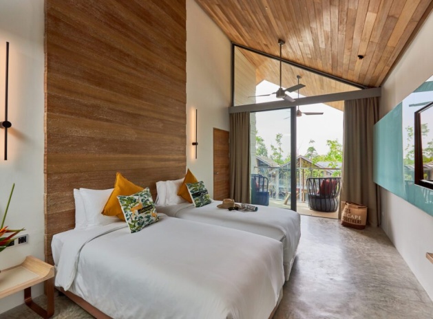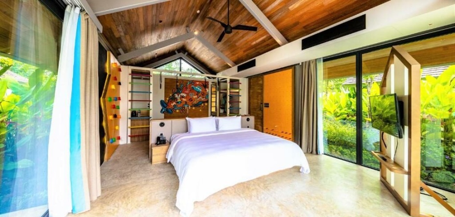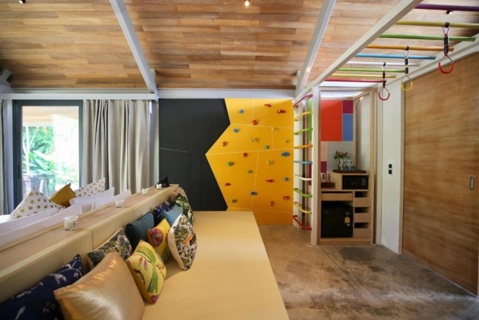 В зоне Play, двуспальная кровать king-size или 2 односпальные кровати, окна от пола до потолка, ванная комната с душем, терраса с лежаками, выход к саду (есть стенка для скалолазания, шведская стенка, спортивные кольца);