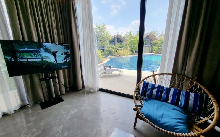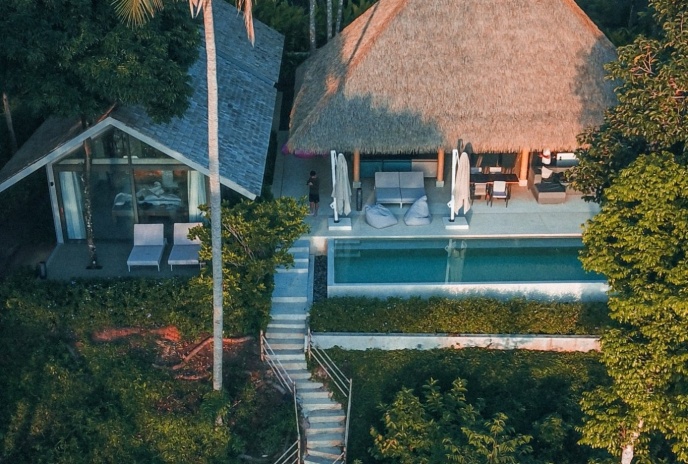 В зоне Ocean, 2 спальни: двуспальная кровать king-size и 2 односпальные кровати, 2 ванные комнаты с ванной и душем, отдельная гостиная комната, мини-кухня, терраса с зоной отдыха и обеденным столом, плавучие кресла-мешки, персональный бассейн, вид на океан, барбекю по запросу, услуги личного шеф-поварва (по запросу), беседка-сала с бильярдным столом и принадлежностями для барбекю, велосипед, доступ к пляжу по частной тропе прямо от вашей виллы, вид на океан;