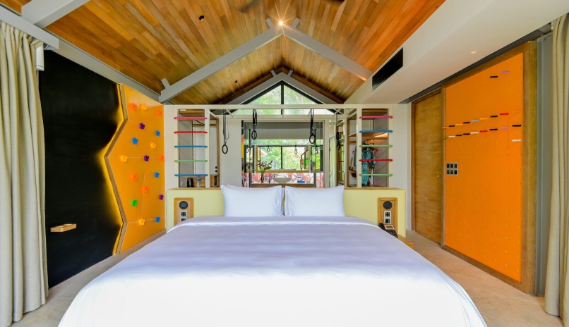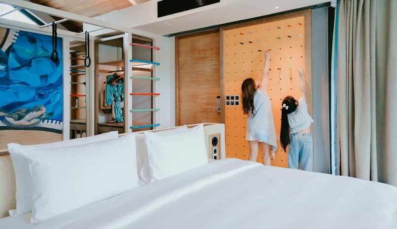 В зоне Splash, двуспальная кровать king-size или 2 односпальные кровати, окна от пола до потолка, ванная комната с душем, прямой доступ в бассейн с террасы номера (есть стенка для скалолазания, шведская стенка, спортивные кольца);