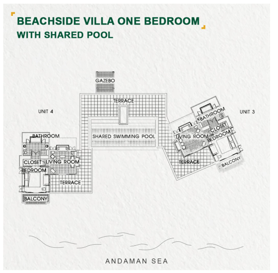 Расположены у пляжа, 2 спальни: двуспальная кровать и 2 односпальные кровати, 2 ванные комнаты, частично открытая гостиная комната с обеденной зоной, кухня, терраса, персональный бассейн, вид на океан, см.план номера;