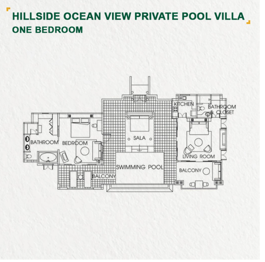 Расположены на высоте 60–80 метров над уровнем моря, спальня с двуспальной кроватью king-size или 2 односпальными кроватями, ванная комната с ванной и душем, гостиная комната, кухня, гостевой туалет, персональный бассейн (бассейн не огорожен и не подходит для детей младше 12 лет), беседка-сала, балкон, вид на океан, см.план номера;
