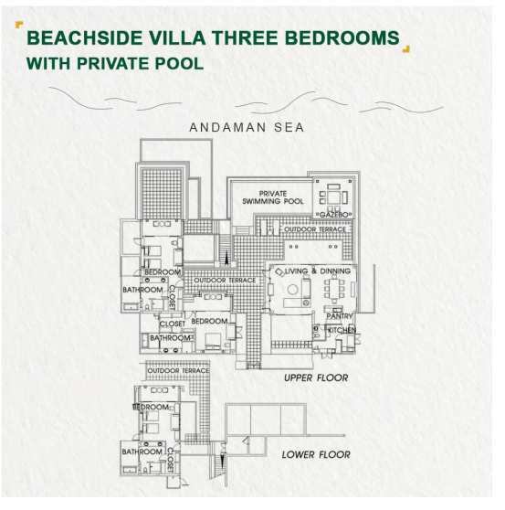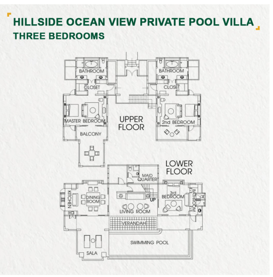 Расположены на высоте 60–80 метров над уровнем моря, двухэтажные номера 3 спальни с двуспальными кроватями king-size или двуспальная кровать king-size и 4 односпальные кровати, 3 ванные комнаты, отдельная гостиная комната и обеденная зона, кухня, балкон, персональный бассейн (бассейн не огорожен и не подходит для детей младше 12 лет), терраса, беседка-сала, вид на океан, см.план номера;