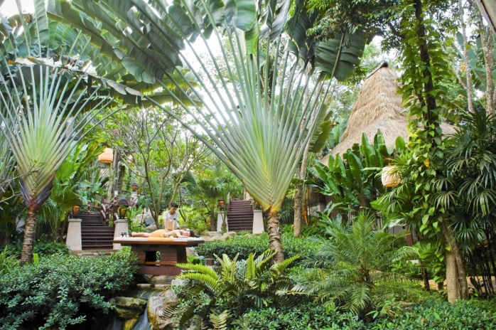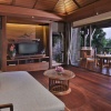 Спальня с двуспальной кроватью king-size, отдельная гостиная комната, частично открытая ванная комната с ванной, терраса, лежаки, вид на сад, см.план номера;