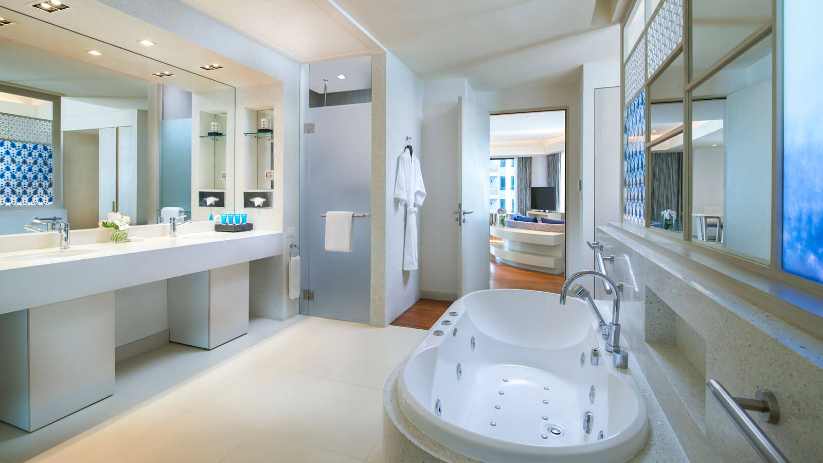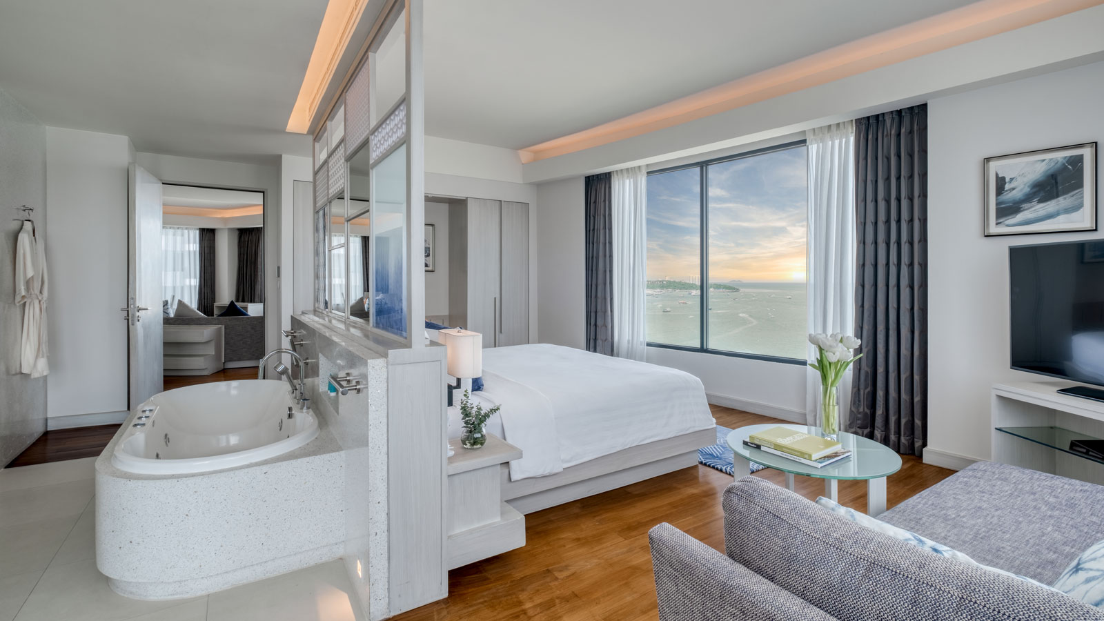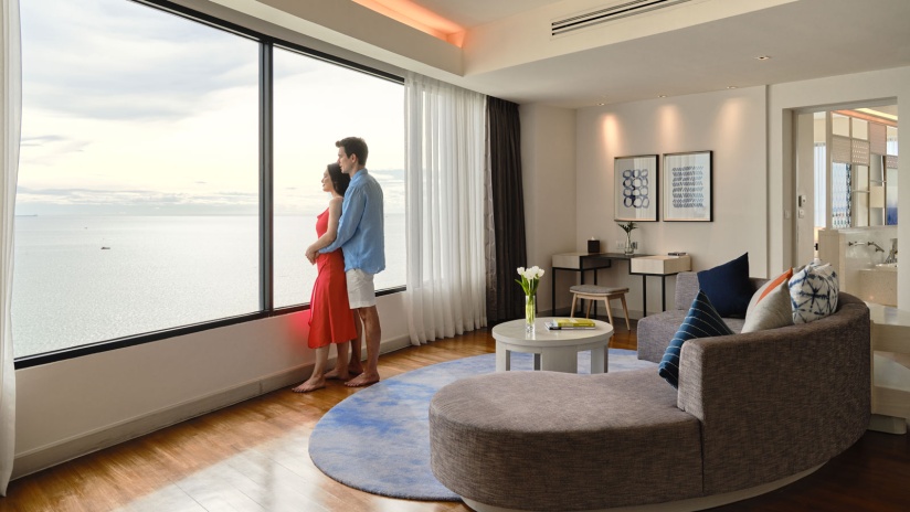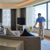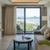 Расположен на верхнем этаже, спальня с двуспальной кроватью king-size, отдельная гостиная комната с диваном, обеденным столом и кухней, ванная комната с ванной и душем, балкон, бесплатный приветственный мини-бар (безалкогольные напитки; один раз за весь период проживания), панорамный вид на залив, доступ в эксклюзивный лаунж-клуб Napha.