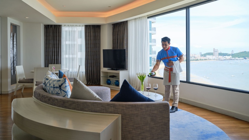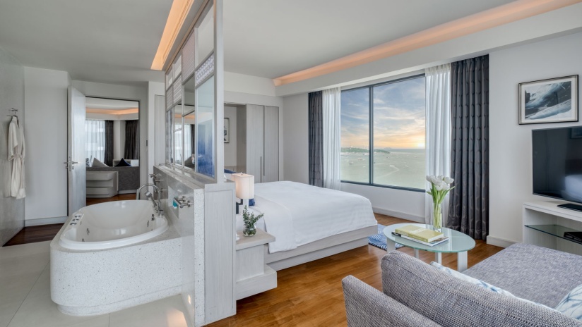 Расположен на верхнем этаже, спальня с двуспальной кроватью king-size, отдельная гостиная комната с диваном, обеденным столом и кухней, ванная комната с ванной и душем, балкон, бесплатный приветственный мини-бар (безалкогольные напитки; один раз за весь период проживания), панорамный вид на залив, доступ в эксклюзивный лаунж-клуб Napha.