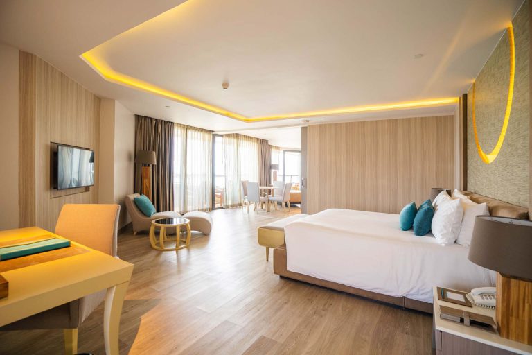 Deluxe Room (41-52 м², макс. 3 или 2+2). Номера расположены в главном здании, начиная с 5-го этажа, двуспальная кровать, гостиная зона с креслом, ванная комната с ванной и душем, меблированный балкон, вид на море. При размещении: 2+1 - ребёнок бесплатно на кровати с родителями, при размещении 2+2 - один ребёнок с родителями, второй платно на дополнительной кровати;