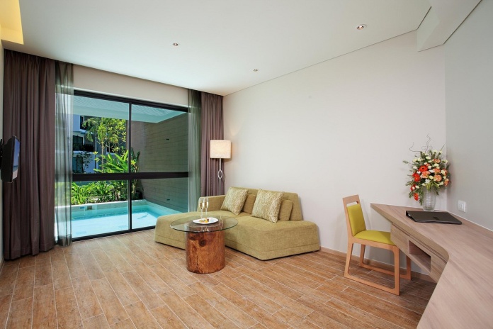 Стильный просторный люкс, отдельная спальня  с двуспальной кроватью king-size, большая светлая гостиная, отдельная ванная комната с душем, гостям предоставляются набор для бритья, тапочки и халаты, возможна установка дополнительного спального места, меблированная терраса с кушеткой и собственный небольшой бассейн на свежем воздухе, вид на бассейн.