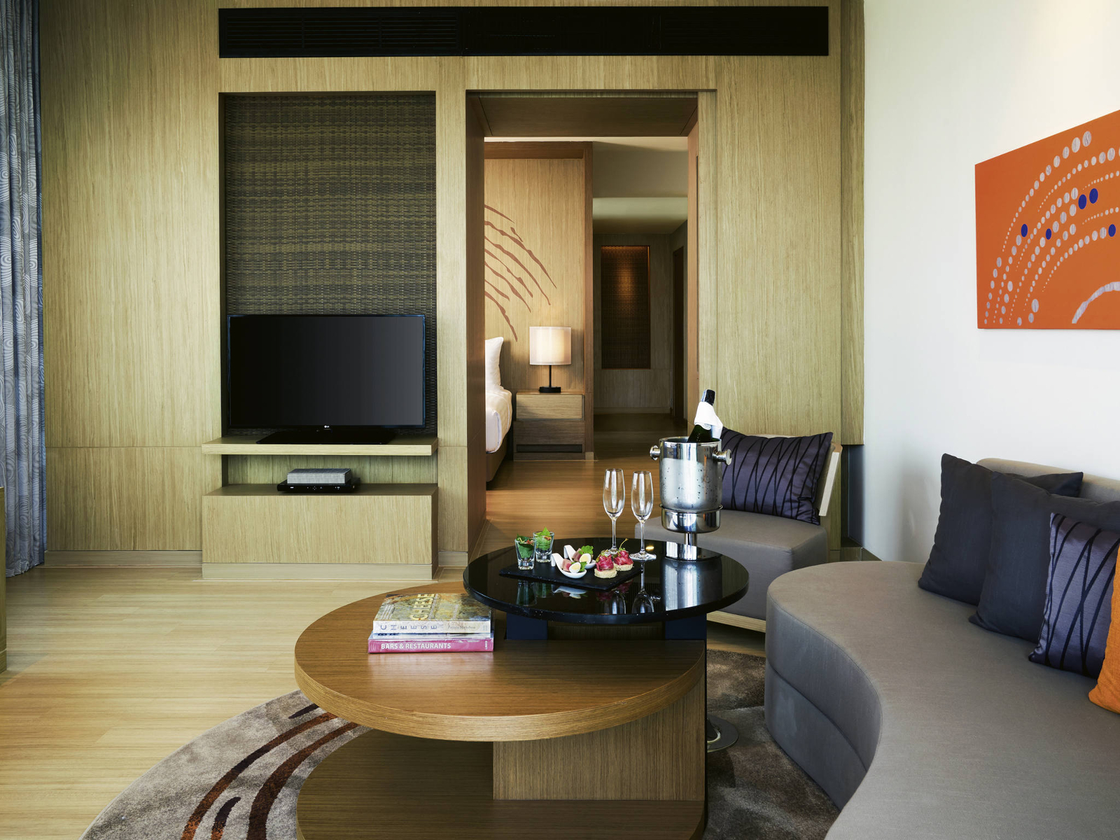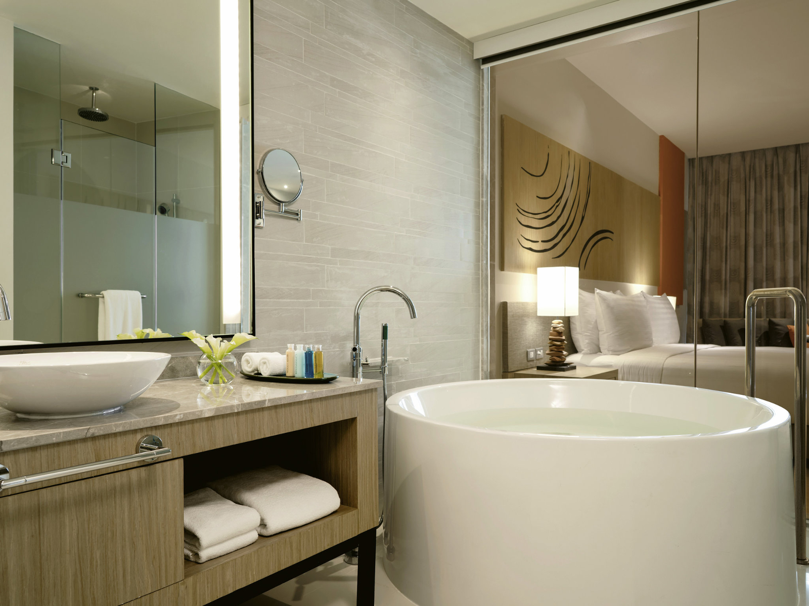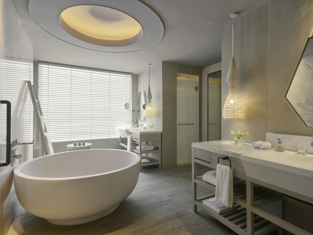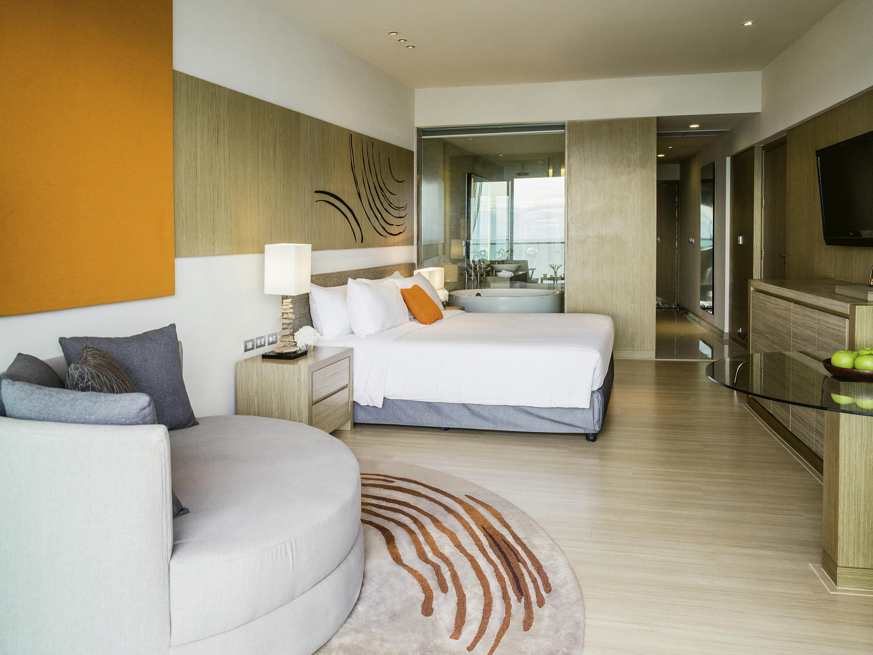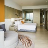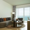 Люкс со спальней с двуспальной кроватью king size и отдельной гостиной, возможность установки дополнительного спального места, окна от пола до потолка; отдельная ванная комната со стеклянной стеной и рольшторой, с душем и ванной; меблированный балкон, вид на море; гости номера пользуются привилегиями lounge access*;