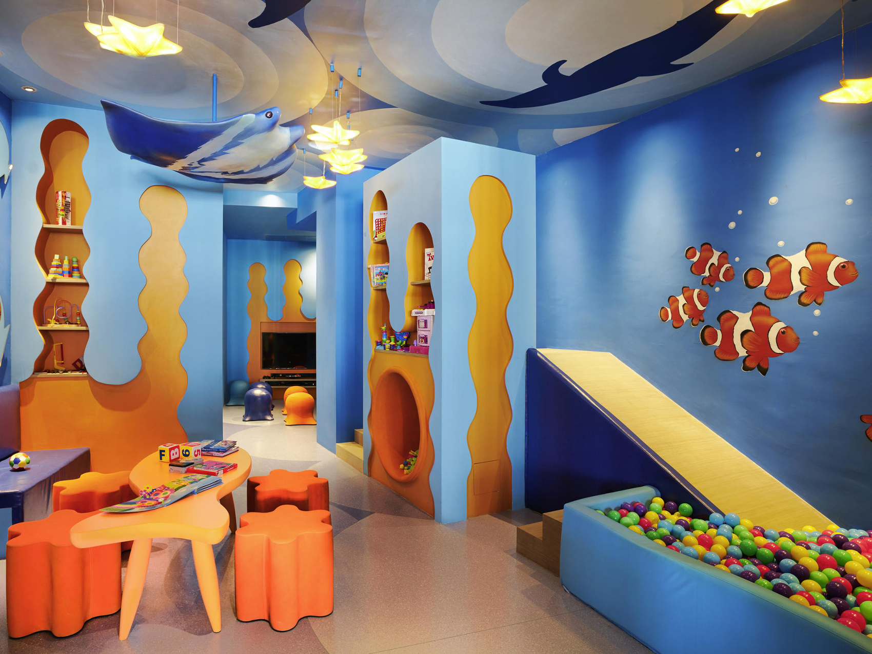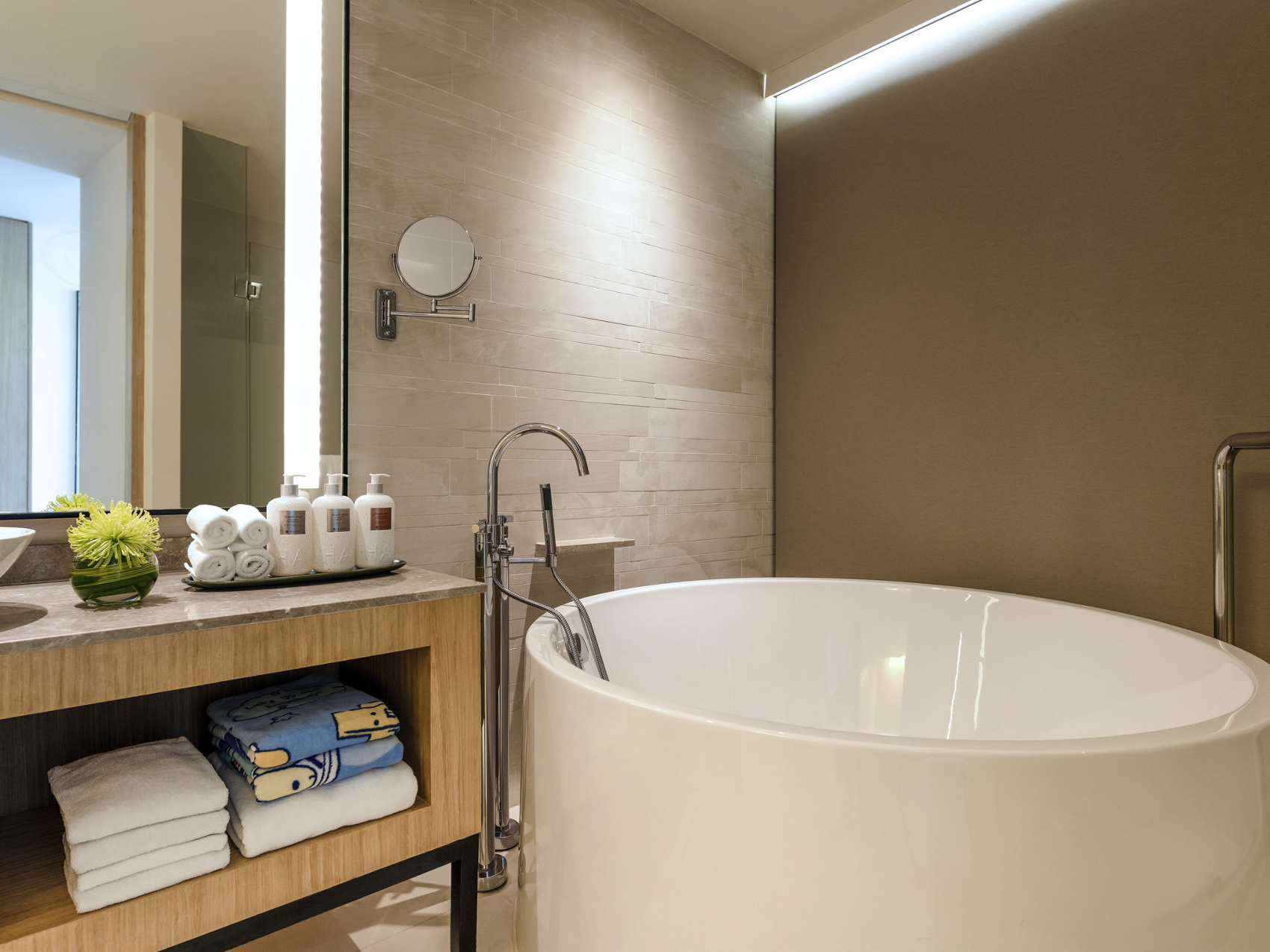 Номер с двуспальной кроватью king size и двухъярусной кроватью для детей (107см х 190см), гостиный уголок с диваном, дополнительное спальное место не предоставляется, окна от пола до потолка, отдельная ванная комната со стеклянной стеной и рольшторой, с душем и ванной; детские игрушки и принадлежности, подарок для ребенка, приставка Play Station по запросу; меблированный балкон, вид на море;