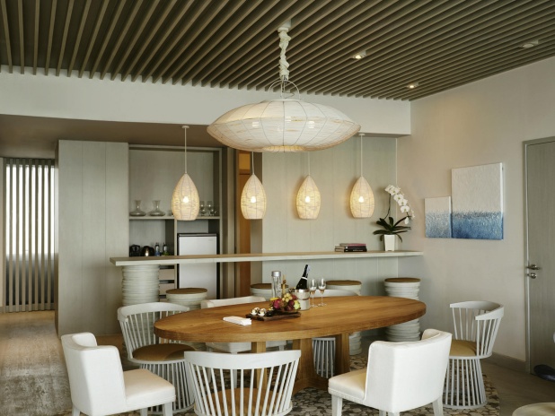 Президентский люкс со спальней с двуспальной кроватью king size, отдельная гостиная с обеденной зоной и барной стойкой, рабочая зона, окна от пола до потолка; отдельная ванная комната со стеклянной стеной и рольшторой, с душем и ванной; кофемашина Nespresso; меблированный балкон с кушеткой, вид на море; гости номера пользуются привилегиями lounge access*;