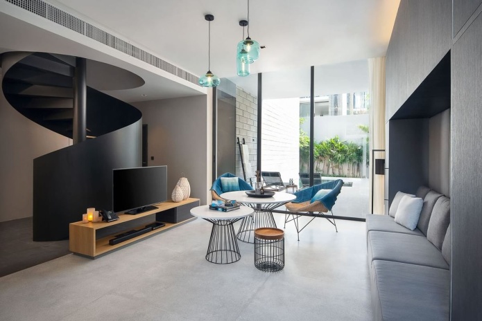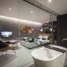 Двухуровневый номер, винтовая лестница, двуспальная кровать king-size, отдельная гостиная комната, ванная комната с ванной и душем, частный бассейн с лежаками;