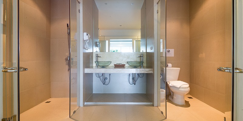 На верхних (3-4) этажах отеля, спальня с двуспальной кроватью king-size, отдельная гостиная комната с диваном, обеденным столом и мини кухней (микроволновая печь, холодильник) ванная комната с ванной, меблированная терраса с частным бассейном, вид на море;