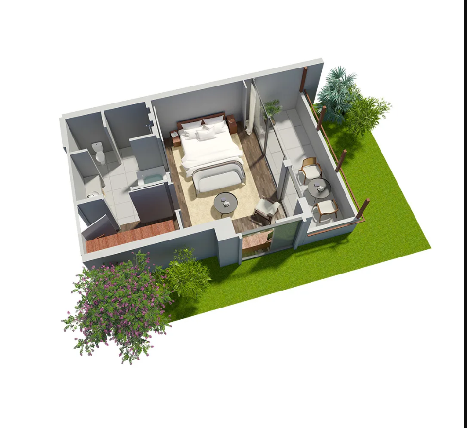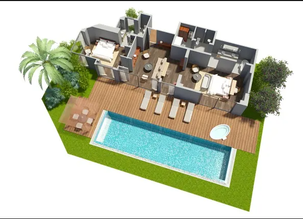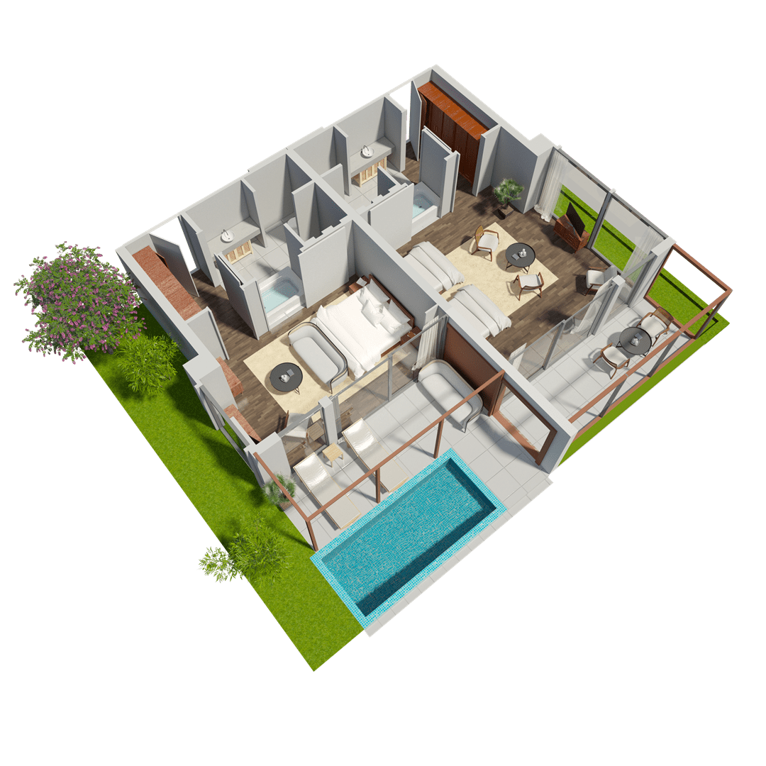 2 спальни с двуспальными кроватями king-size, отдельная гостиная комната с диваном, 2 ванные комнаты ( одна с ванной и душем, вторая только с душем), терраса с лежаками, персональный бассейн размера 13 х 3 м и сад, душ под открытым небом, услуги дворецкого, беседка, см.план номера;