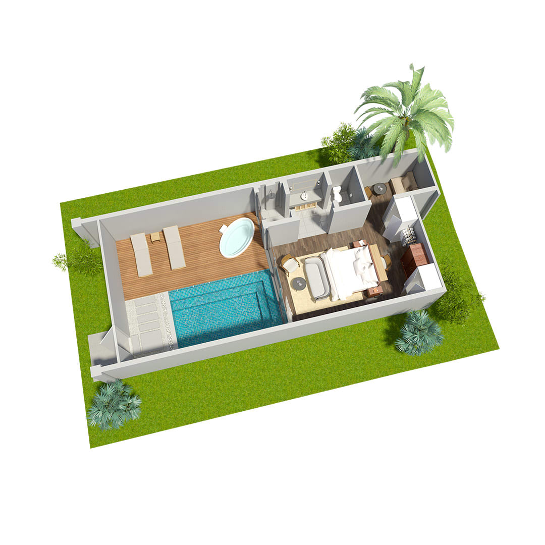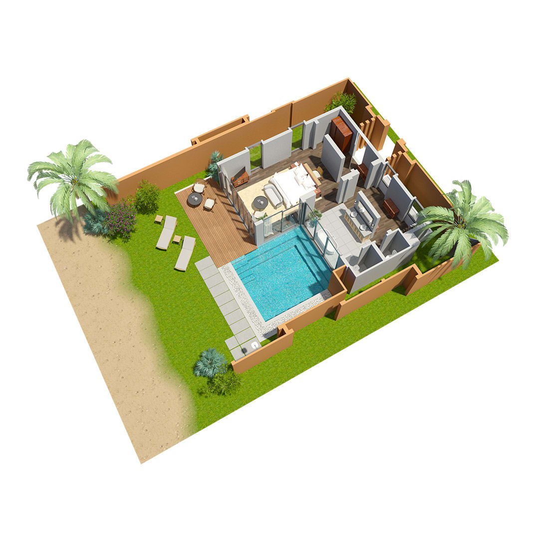 Двуспальная кровать king-size, гостиная зона с диваном, ванная комната с ванной и душем, терраса, лежаки, небольшой персональный бассейн размера 5 х 4 м и сад, душ под открытым небом, прямой выход на пляж, услуги дворецкого, см.план номера;