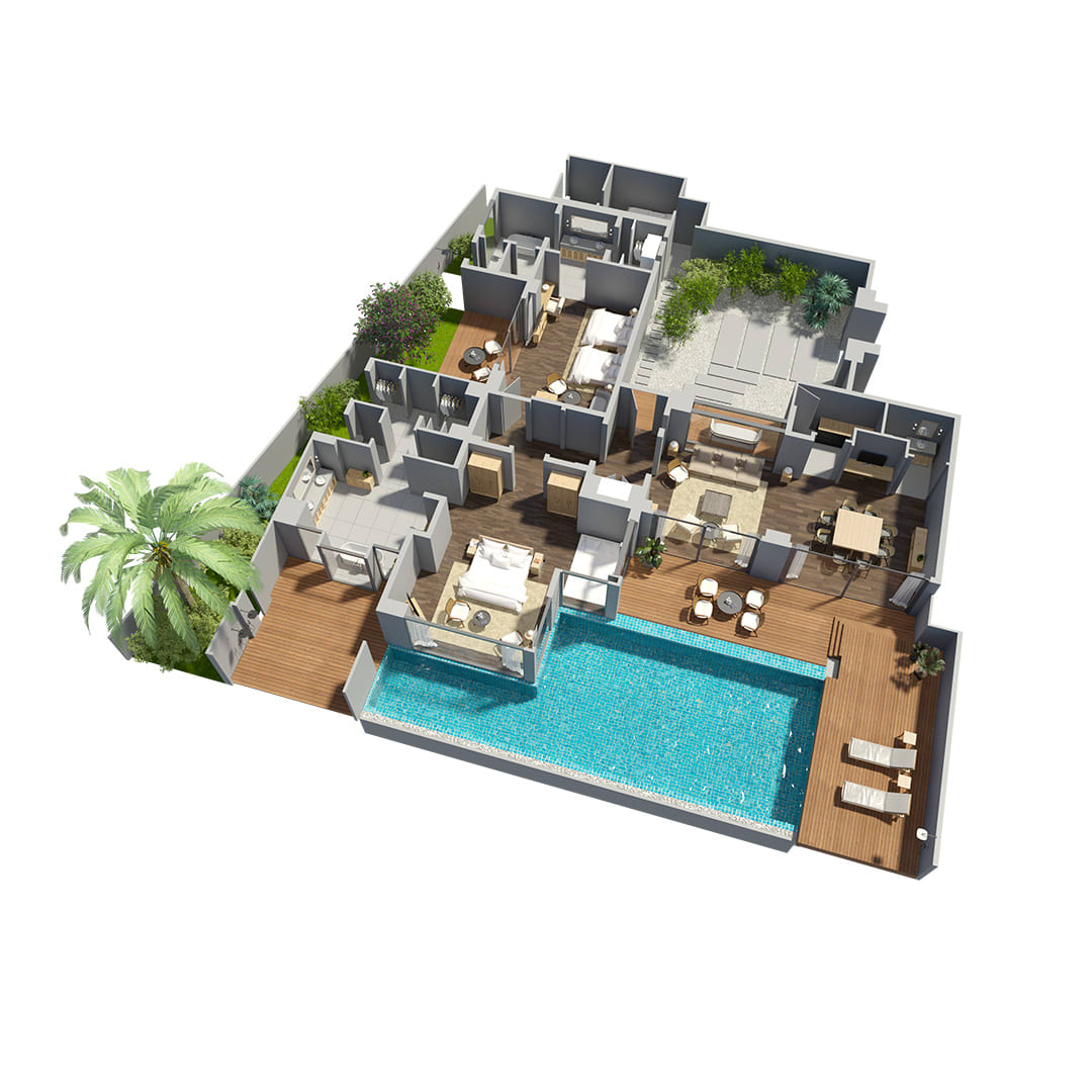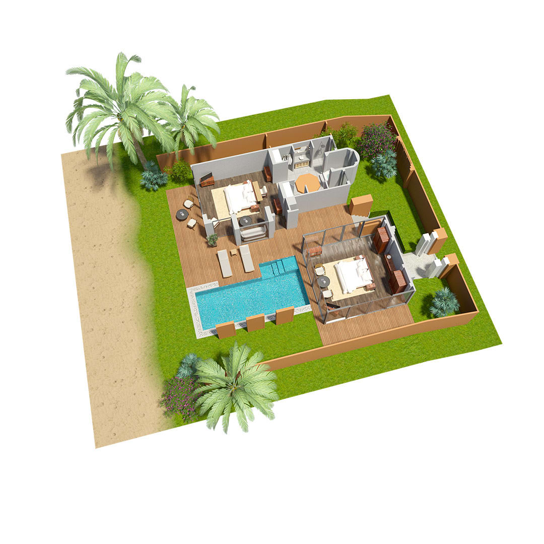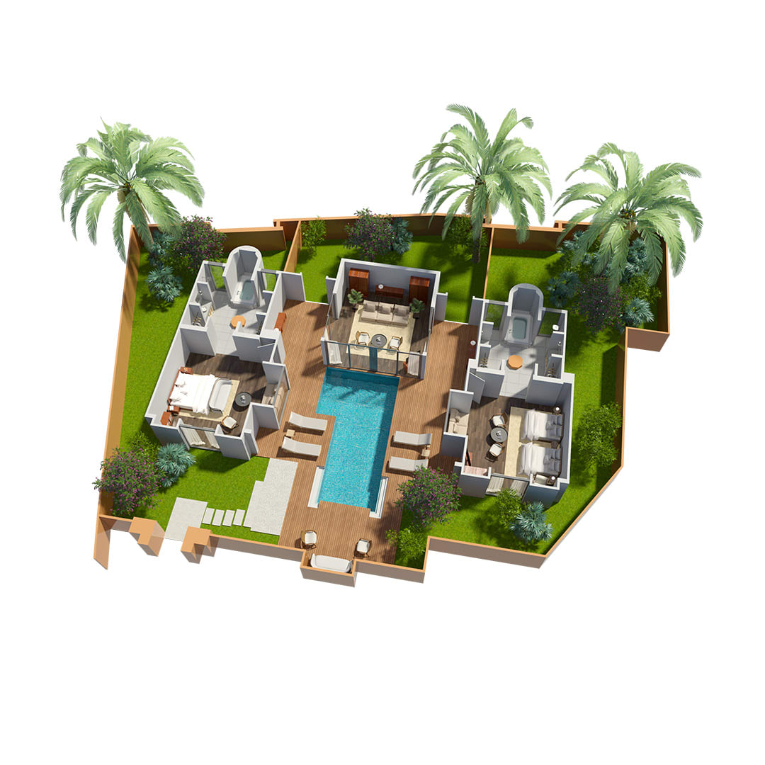 2 спальни: двуспальная кровать king-size и 2 односпальные кровати, отдельная гостиная комната с диваном и обеденным столом, мини-кухня, 2 ванные комнаты с ванной и душем, гардеробная, меблированная терраса с обеденным столом и лежаками, 2 душа под открытым небом, персональный бассейн размера 17 х 5 м и сад, прямой доступ на пляж, услуги дворецкого, см.план номера;