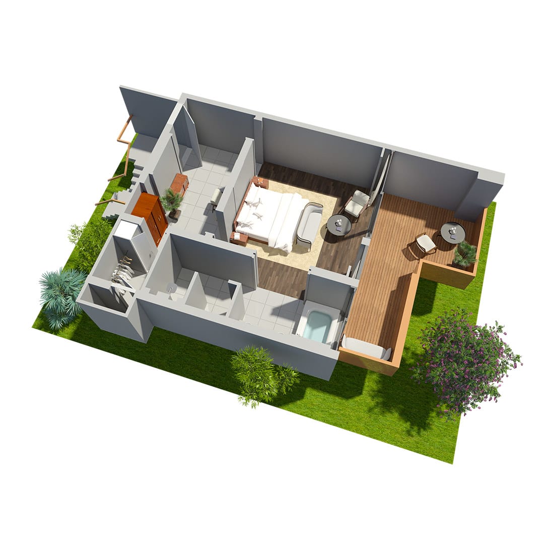Двуспальная кровать king-size, гостиная зона с диваном, ванная комната с душем, терраса, ванна на террасе и небольшой персональный бассейн размера 5 х 3 м, см.план номера;
