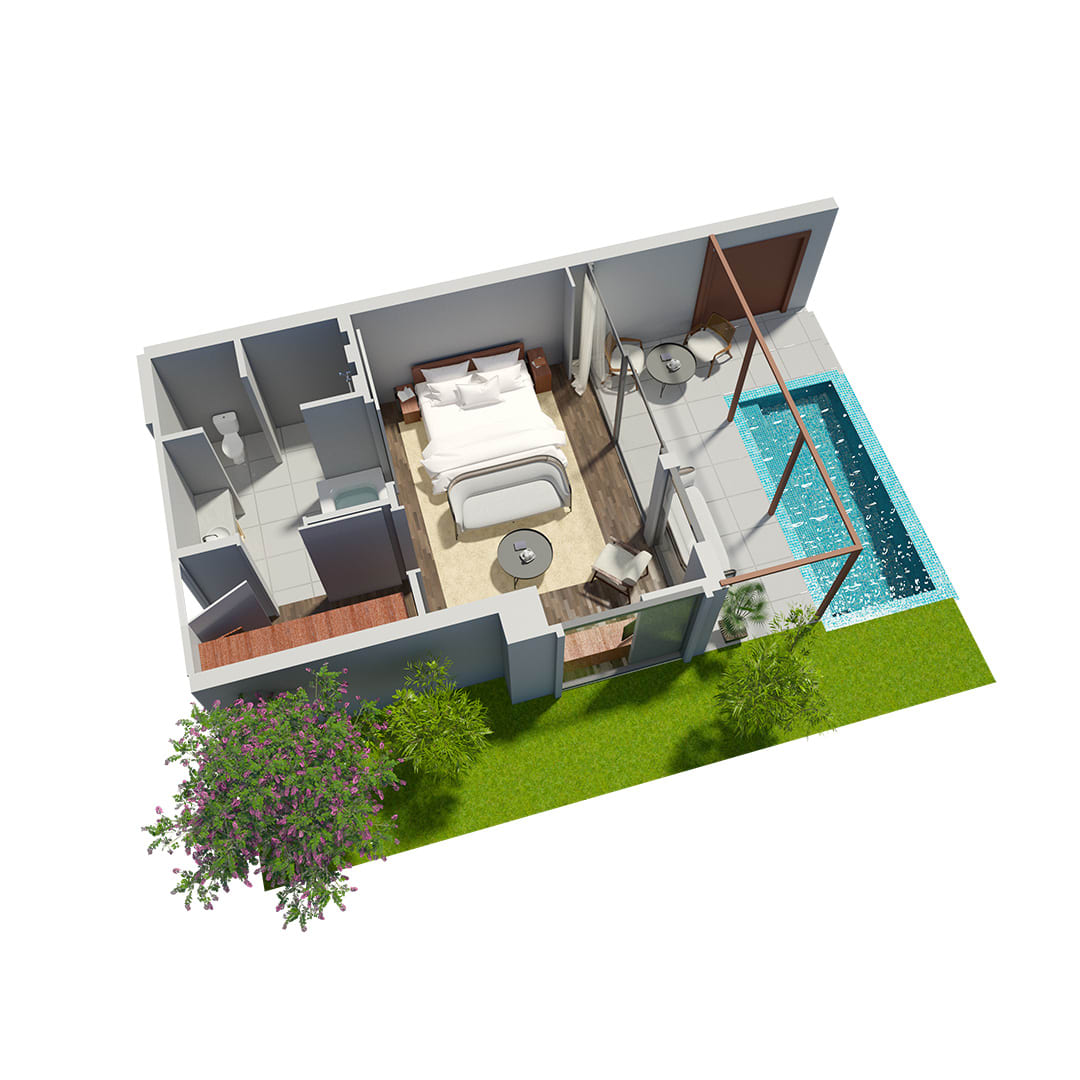 - Deluxe Pool Villa (100 м², макс. 2 чел.).