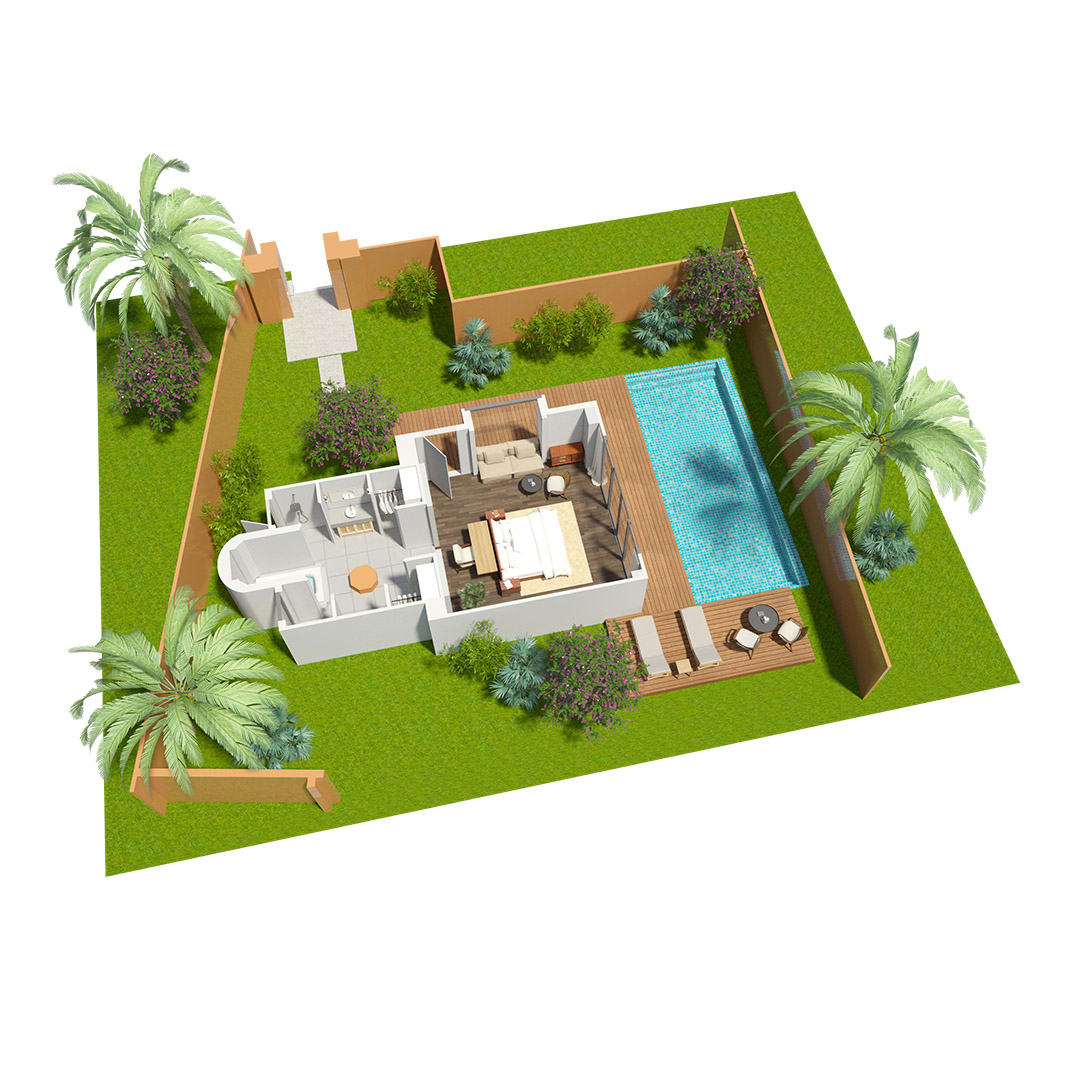 Двуспальная кровать king-size, гостиная зона с диваном, просторная ванная комната с ванной и душем, терраса, лежаки, персональный бассейн размера 7 х 3 м и зона сада, душ под открытым небом, беседка с обеденным столом, услуги дворецкого, см. план номера;