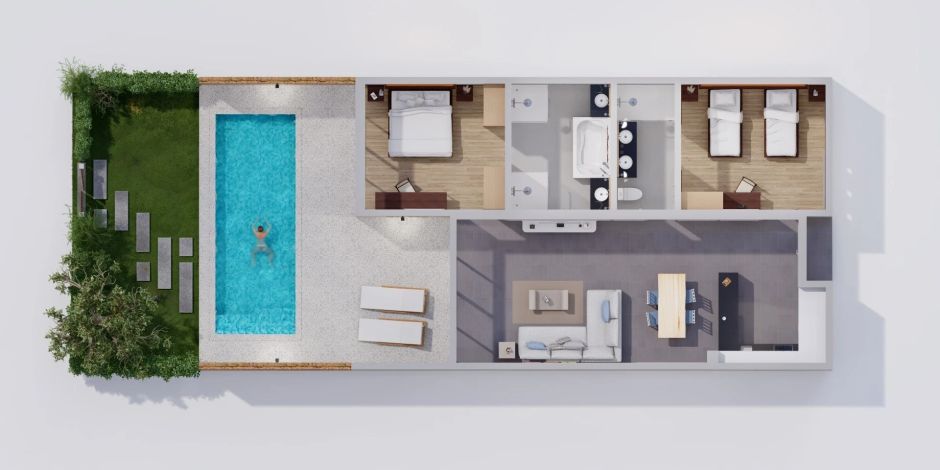 Южная часть включает 70 номеров категории Suite (One и Two Bedroom), а также Two Bedroom Pool Suite с бассейном на первом этаже, и 30 номеров Pavilion (One и Two Bedroom). Северная часть представлена исключительно виллами.
