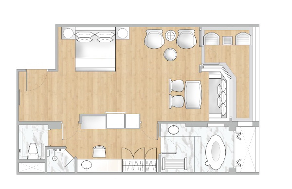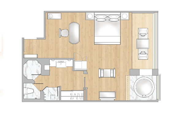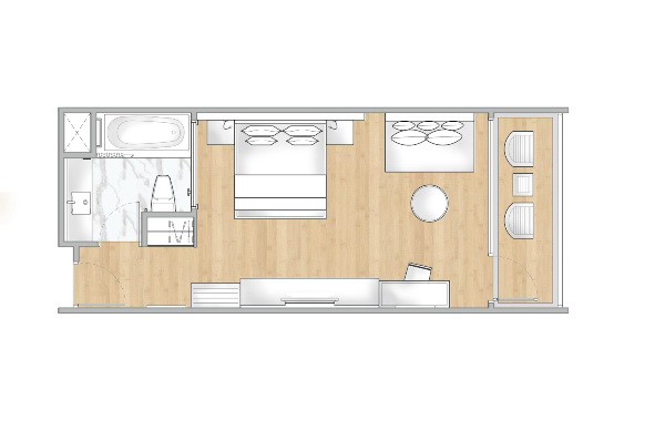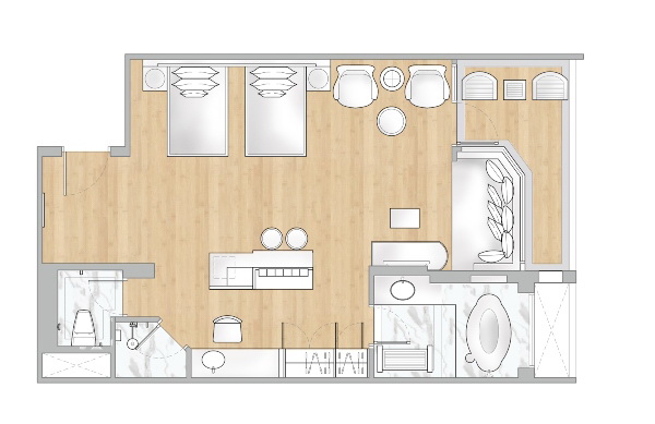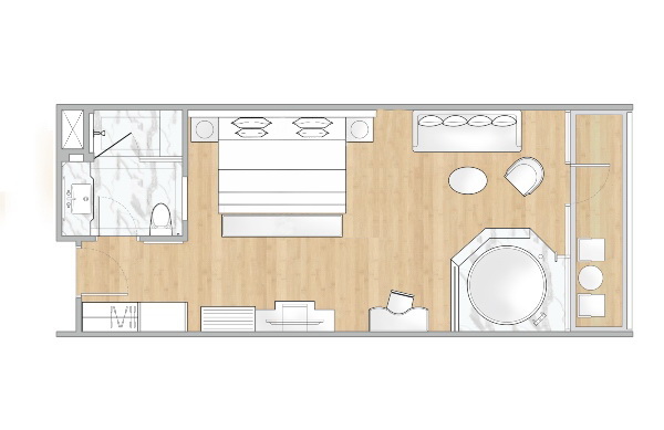 1-й двуспальной кроватью king-size или 2-мя односпальными кроватями, дополнительное спальное место - кушетка, гостиный уголок, обеденный стол, гардеробная, мини-бар, ванная комната с раздельными душем и мраморной ванной-джакузи с видом из окна, меблированный балкон, вид на море/бассейн; план номера;