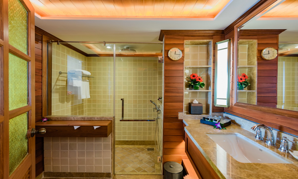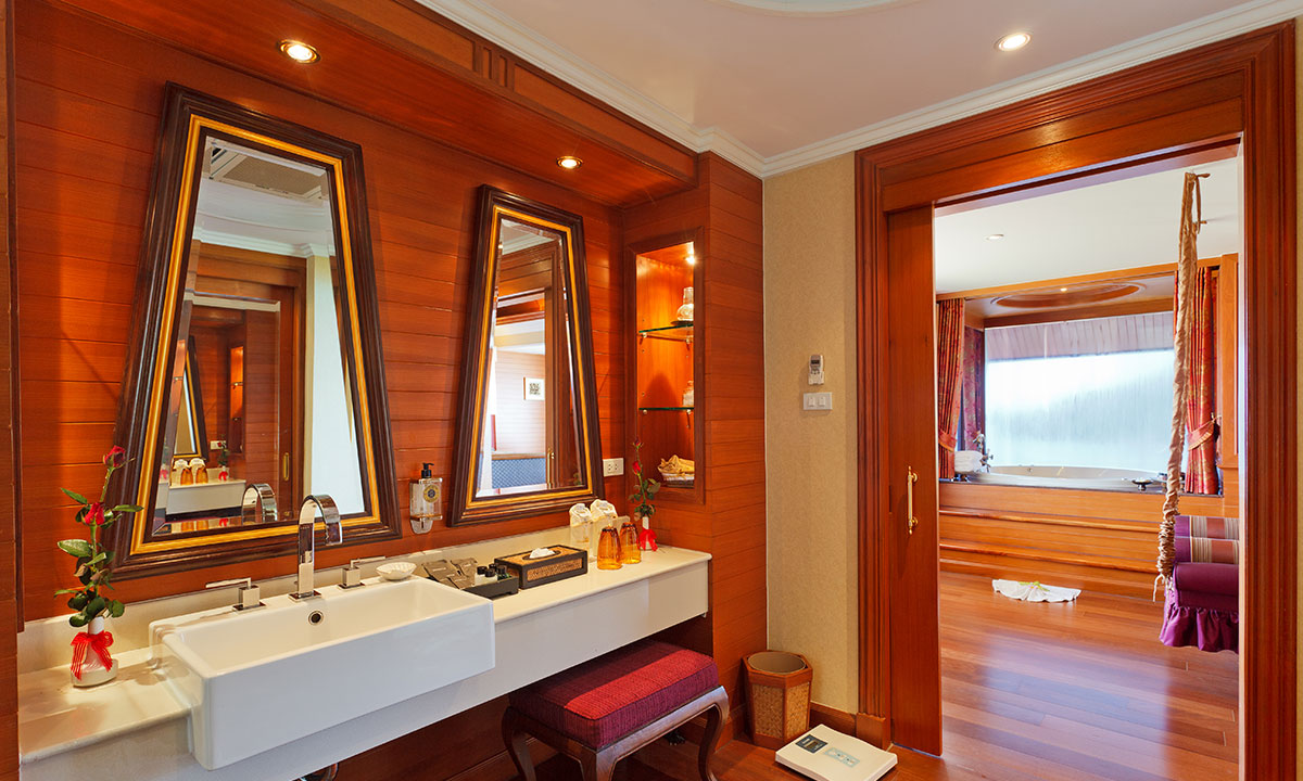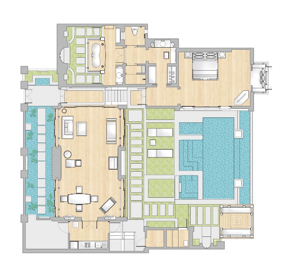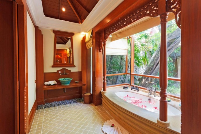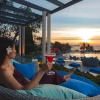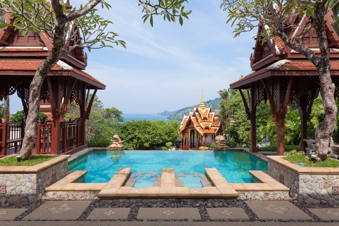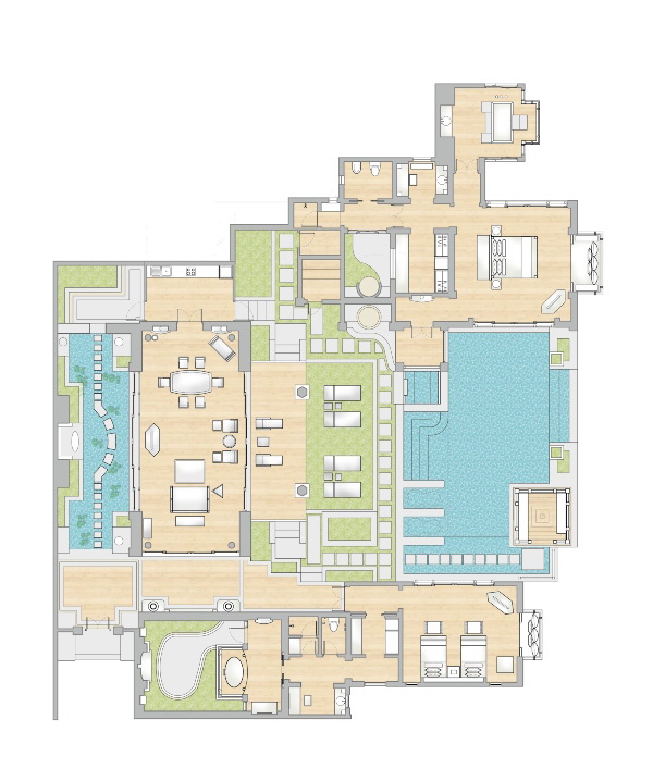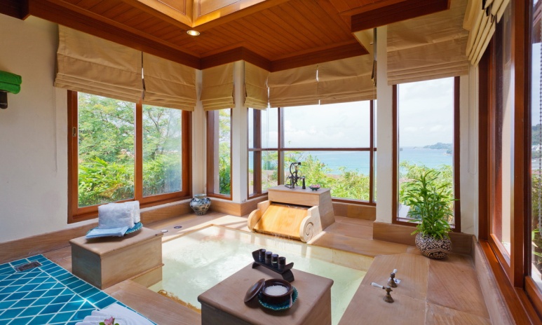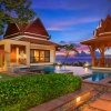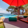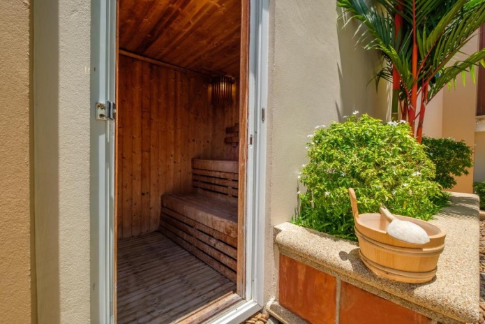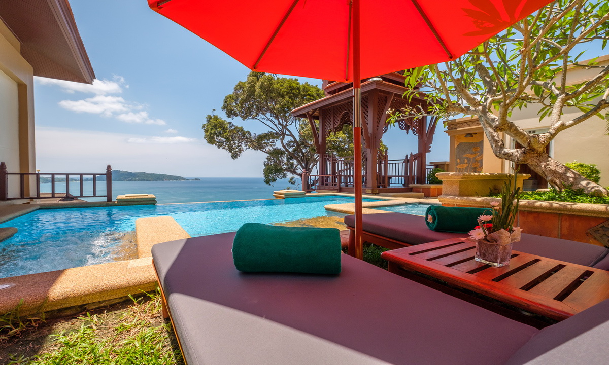 king-size или двумя односпальными кроватями, кушетка у окна; отдельный павильон-гостиная с диваном-качелями, гостевой зоной, баром, обеденной зоной, отдельной кухней; отдельная ванная комната с джакузи, душевая кабина, сауна, гардеробная, душ на свежем воздухе; лужайка у бассейна с шезлонгами и зонтом, беседка-павильон, вид на море;