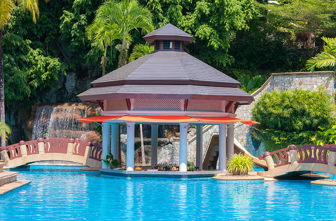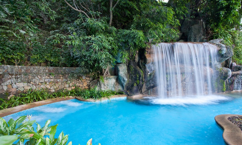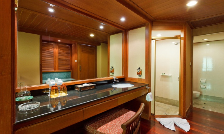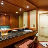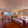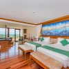 с двуспальной кроватью king-size; отдельная ванная комната с обычным и тропическим душем, гардеробная, отдельная ванна-джакузи для двоих у окна, халат и тапочки; подвесное кресло-качели, зона отдыха со столиком на подиуме у окна с видом на море и закат; рабочий стол, мини-бар, кофеварка Nespresso; без балкона; рядом с водопадом у бассейна Waterfall, вид на море; план номера;