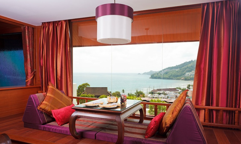 с двуспальной кроватью king-size, отдельная ванная комната с душевой; джакузи для двоих у окна; халат и тапочки; гостиный уголок с диваном, туалетный столик, чайник/кофеварка; просторный меблированный балкон; вид на море; план номера;