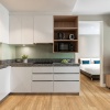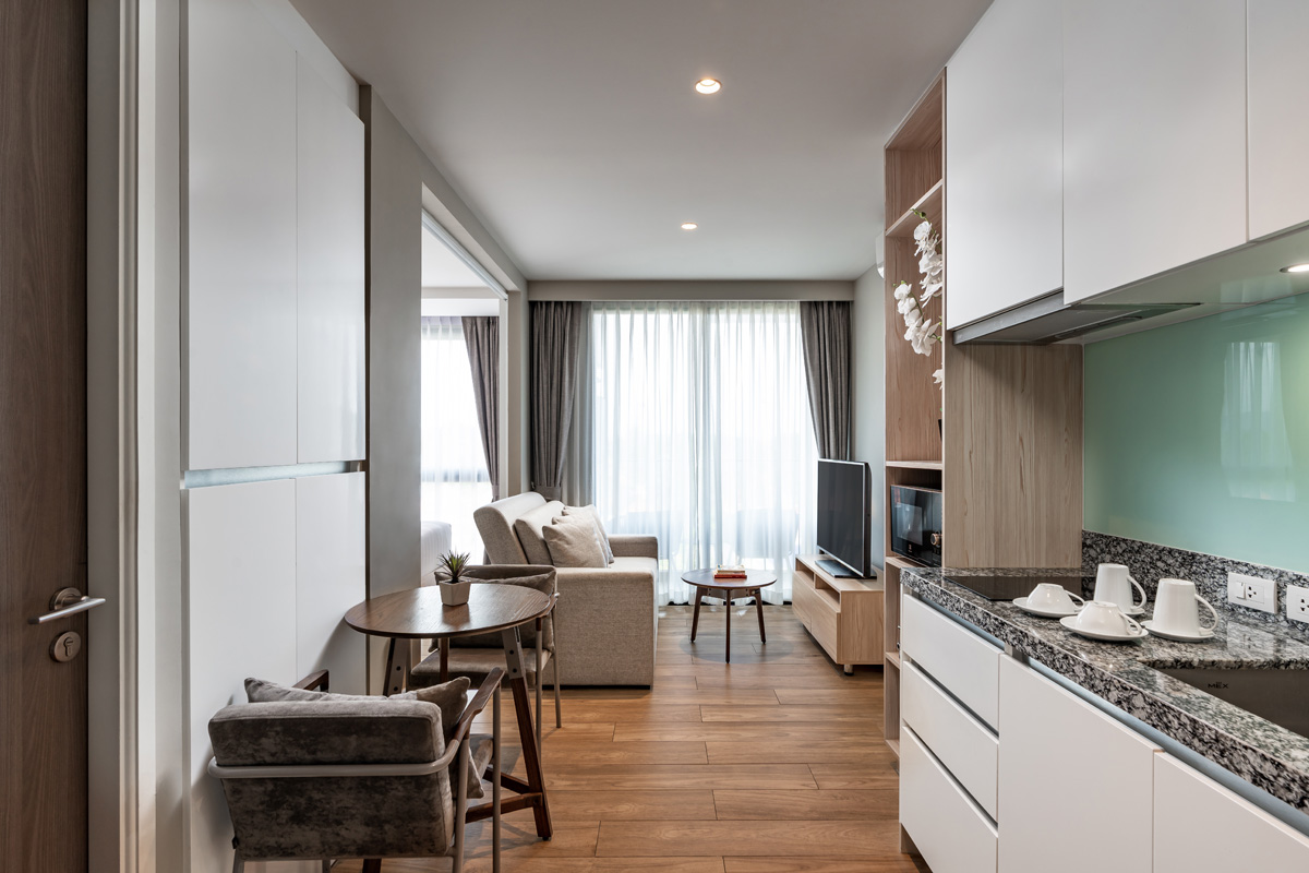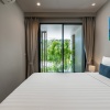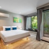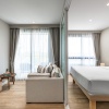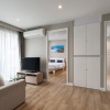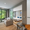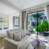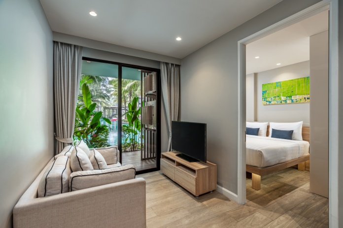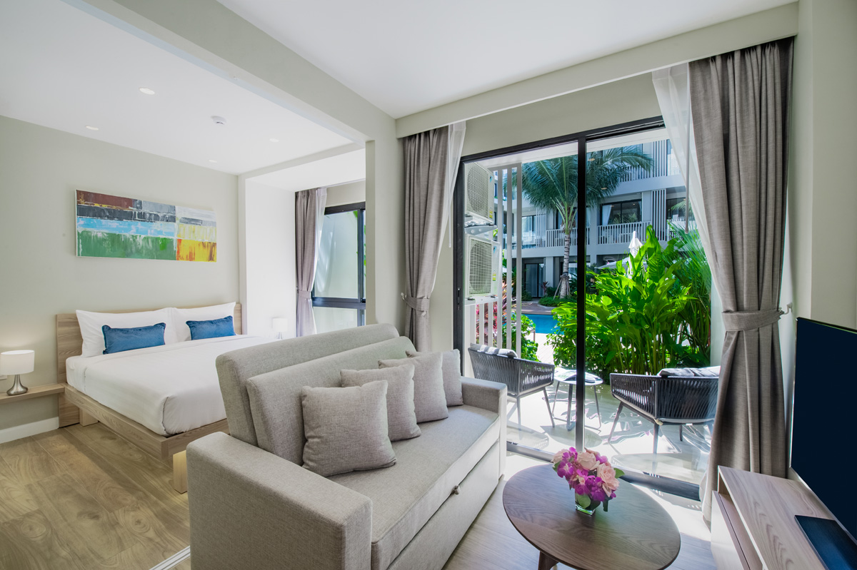 Уютный стильный люкс с двуспальной кроватью queen-size, раздвижная дверь отделяет гостиную с дополнительным спальным местом - диваном, оборудованная кухонной зоной и обеденной зоной на 2 персоны; отдельная ванная комната с тропическим душем; меблированный балкон, вид на бассейн;