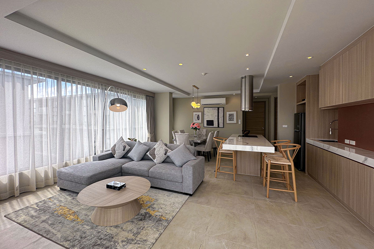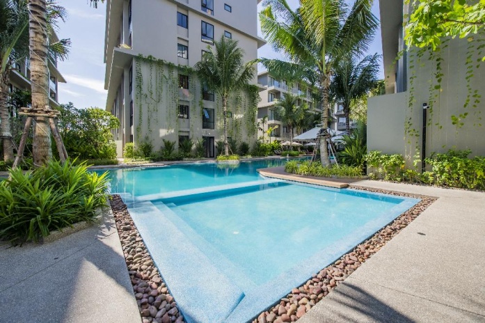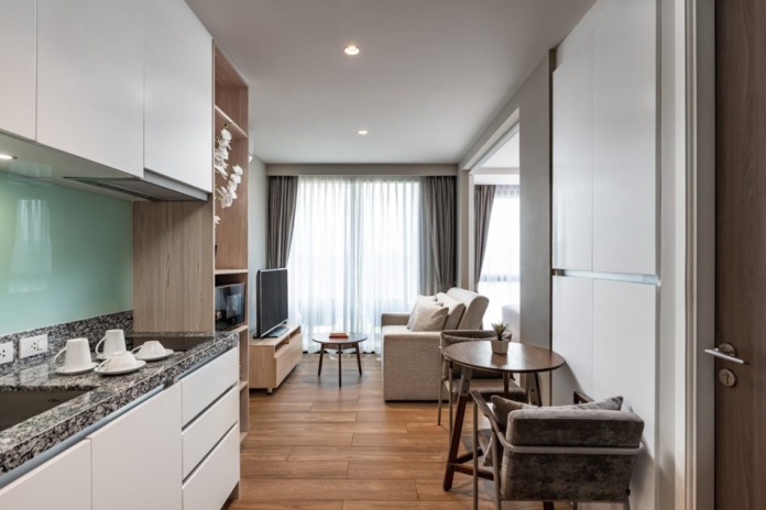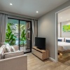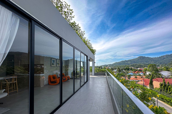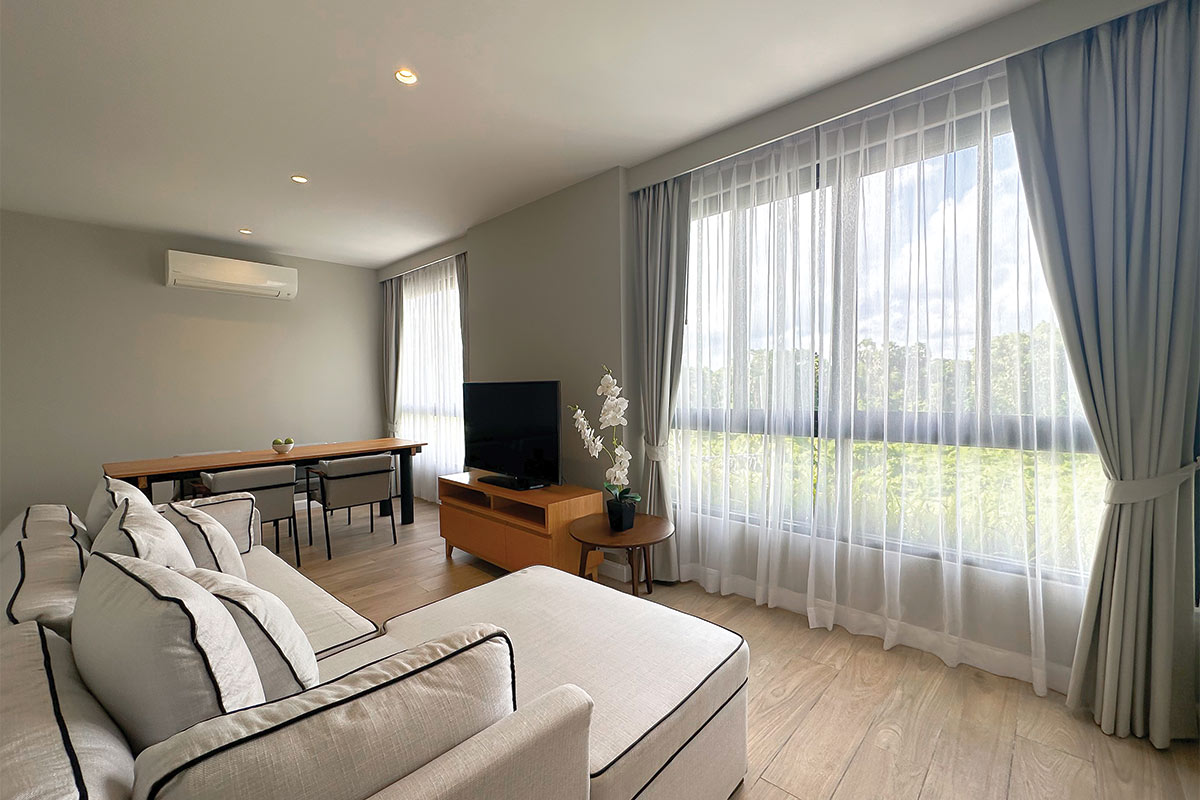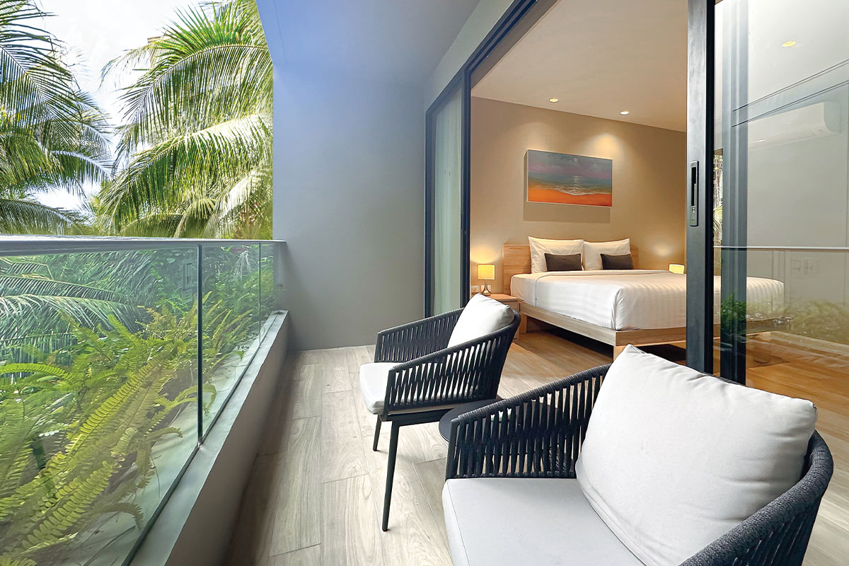 Просторный стильный полулюкс с 1-й двуспальной кроватью queen-size и отдельной ванной комнатой с тропическим душем; отдельная гостиная с дополнительным спальным местом - диваном, оборудованной кухонной зоной и обеденной зоной на 4 персоны; меблированный балкон, терраса с прямым выходом к бассейну; вид на горы/сад;