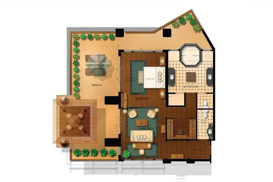 Люкс на верхних этажах, открытая планировка (внутренняя площадь 98 м²) с двуспальной кроватью king-size и гостиной зоной с большим диваном и двумя креслами, возможность дополнительного спального места, отдельная ванная комната с панорамным окном, душем и ванной; туалетно-косметические средства класса люкс (Aromatherapy Associates), гардеробная; собственная терраса (71м²) с павильоном-джакузи для 2-х гостей, беседкой с шезлонгами и обеденной зоной; вид на океан; план номера;