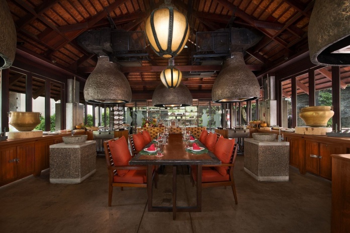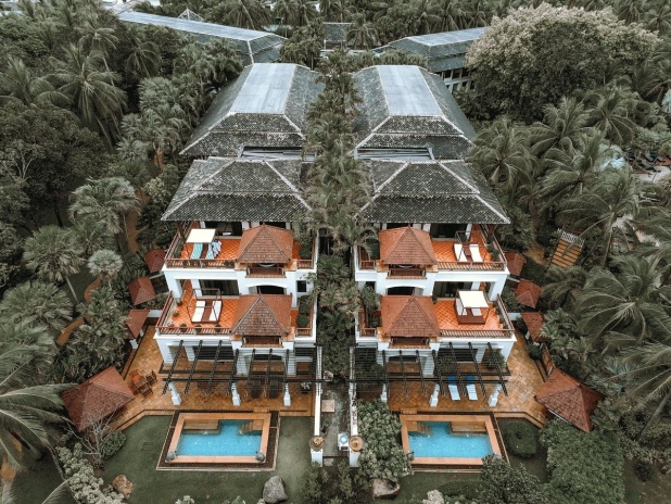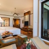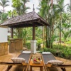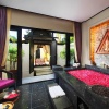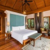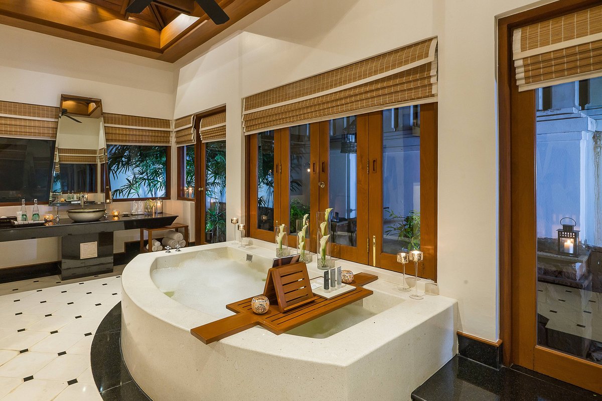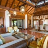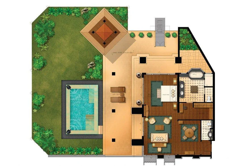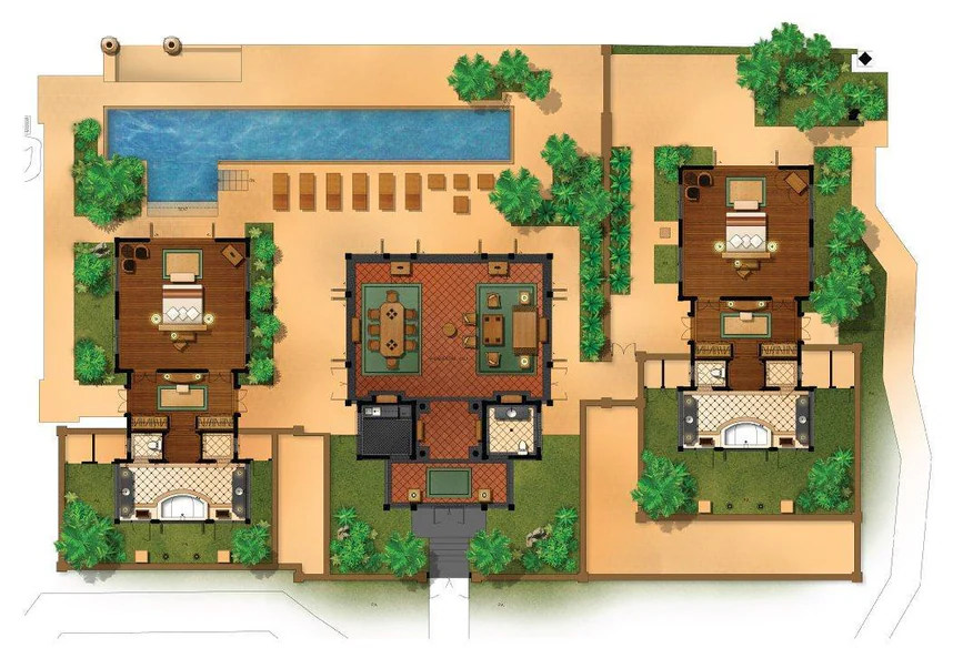 Приватная вилла состоит из 3-х павильонов (площадь внутренних помещений 250 м²): 2 отдельные спальни с дверьми, в каждой - двуспальная кровать king size, гардеробная; возможность дополнительного спального места; отдельная гостиная с диваном и четырьмя креслами, обеденная зона со столом на 8 персон; 3 ванные комнаты: 2 из них с отдельными душем и ванной, одна - с душем; туалетно-косметические средства класса люкс (Aromatherapy Associates); выход на собственную террасу (305 м²) к частному бассейну (65 м²) с шезлонгами; вид на океан; план виллы.