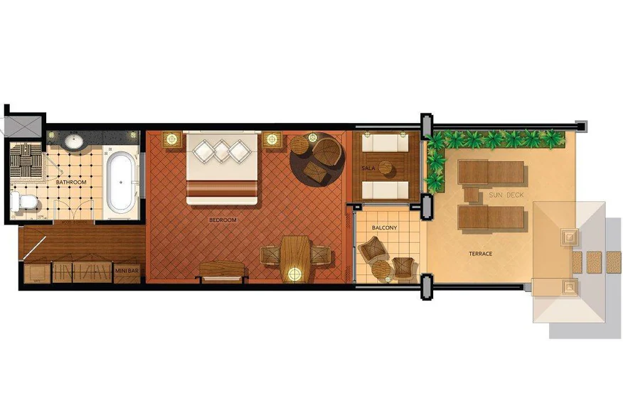 Номер на 1-м этаже c выходом к бассейну; двуспальная кровать king size или 2 односпальные кровати (внутренняя площадь 47 м²), зона отдыха с кушеткой-татами у окна, возможность установки дополнительного спального места, кресло с пуфиком, рабочий стол, отдельная ванная комната с душем и ванной; туалетно-косметические средства класса люкс (Aromatherapy Associates); собственная терраса с шезлонгами (16 м²), вид на бассейн и сад;