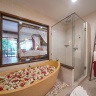 На верхнем этаже, двуспальная кровать или 2 односпальные кровати, кушетка, ванная комната с ванной и душем, балкон, вид на сад и бассейн;