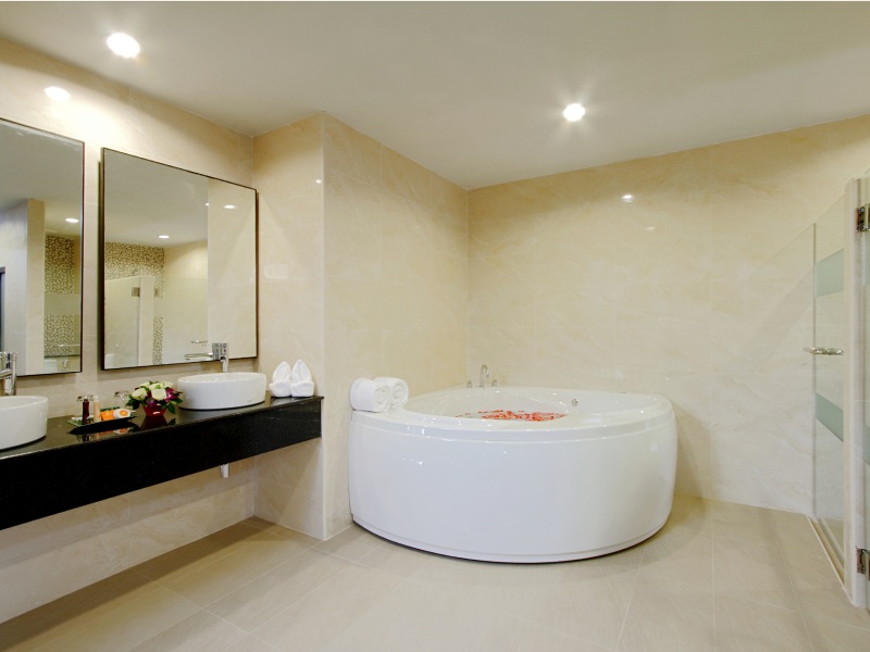 Расположены на 2-5 этажах в угловой части здания с видом на заднюю территорию курорта, двуспальная кровать king-size и двухъярусная кровать для детей, гостиная зона,ванная комната, балкон;