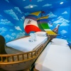 3 спальни: двуспальная кровать, 2 односпальные кровати, 2 односпальные кровати, построенные в форме корабля (в комнате для детей), отдельная гостиная комната с обеденной зоной, 2 ванные комнаты (в одной ванна и душ, в другой - душ), 2 балкона, из главное спальни вид на море, план номера;