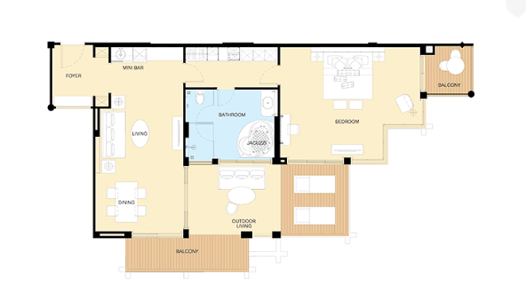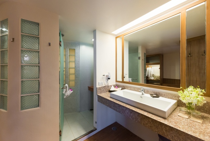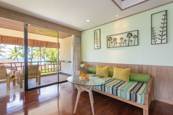 Номера расположены у пляжа, двуспальная кровать king-size или 2 раздельные кровати hollywood, гостиная зона с диваном-кушеткой, ванная комната (со стеклянной стеной) с ванной и душем, меблированный балкон, вид на пляж, план номера;